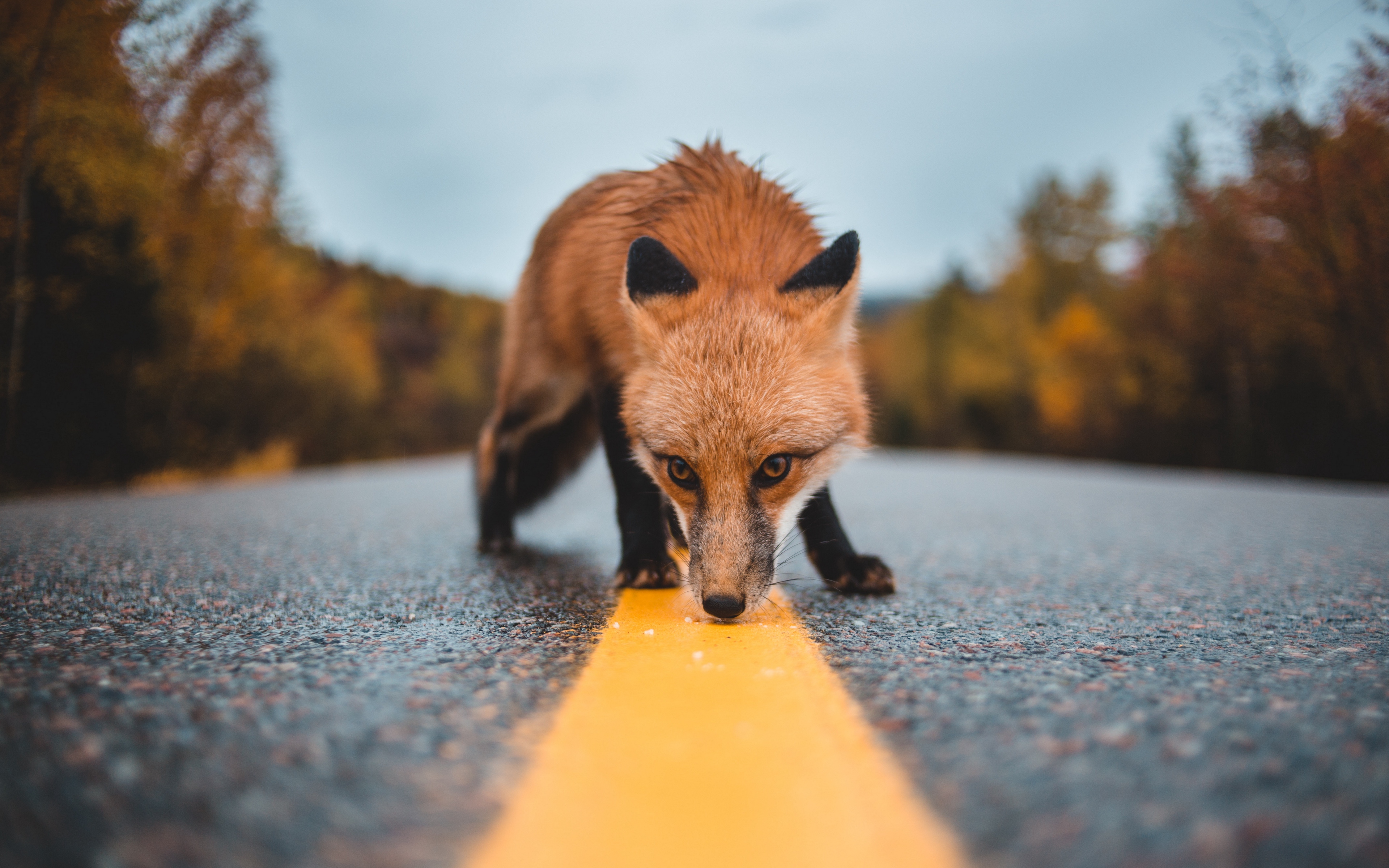 Description: A fox is looking down at a yellow line on the road in the woods.