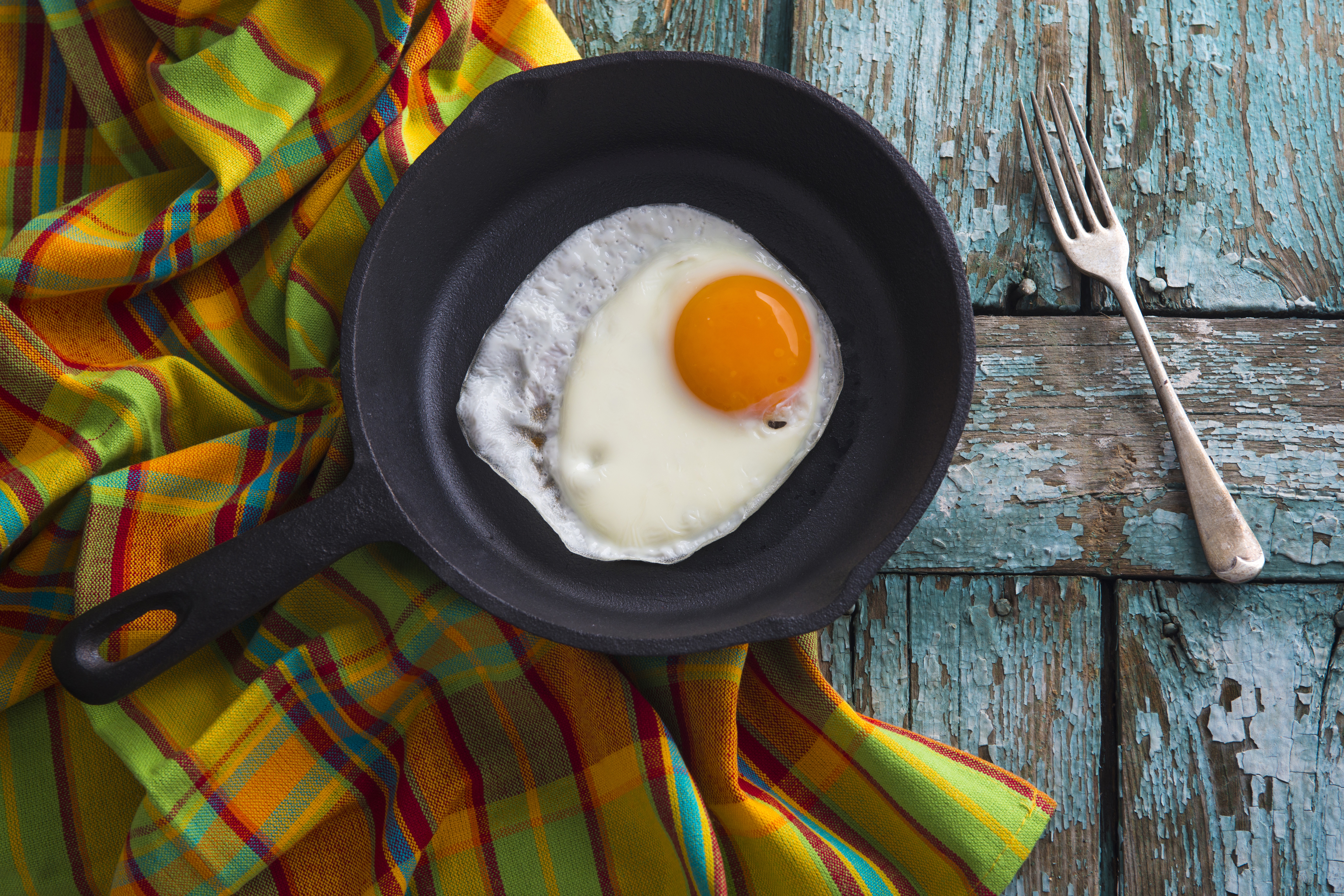 Description: A fried egg in a frying pan with a fork on a tablecloth with a wooden background and a fork.