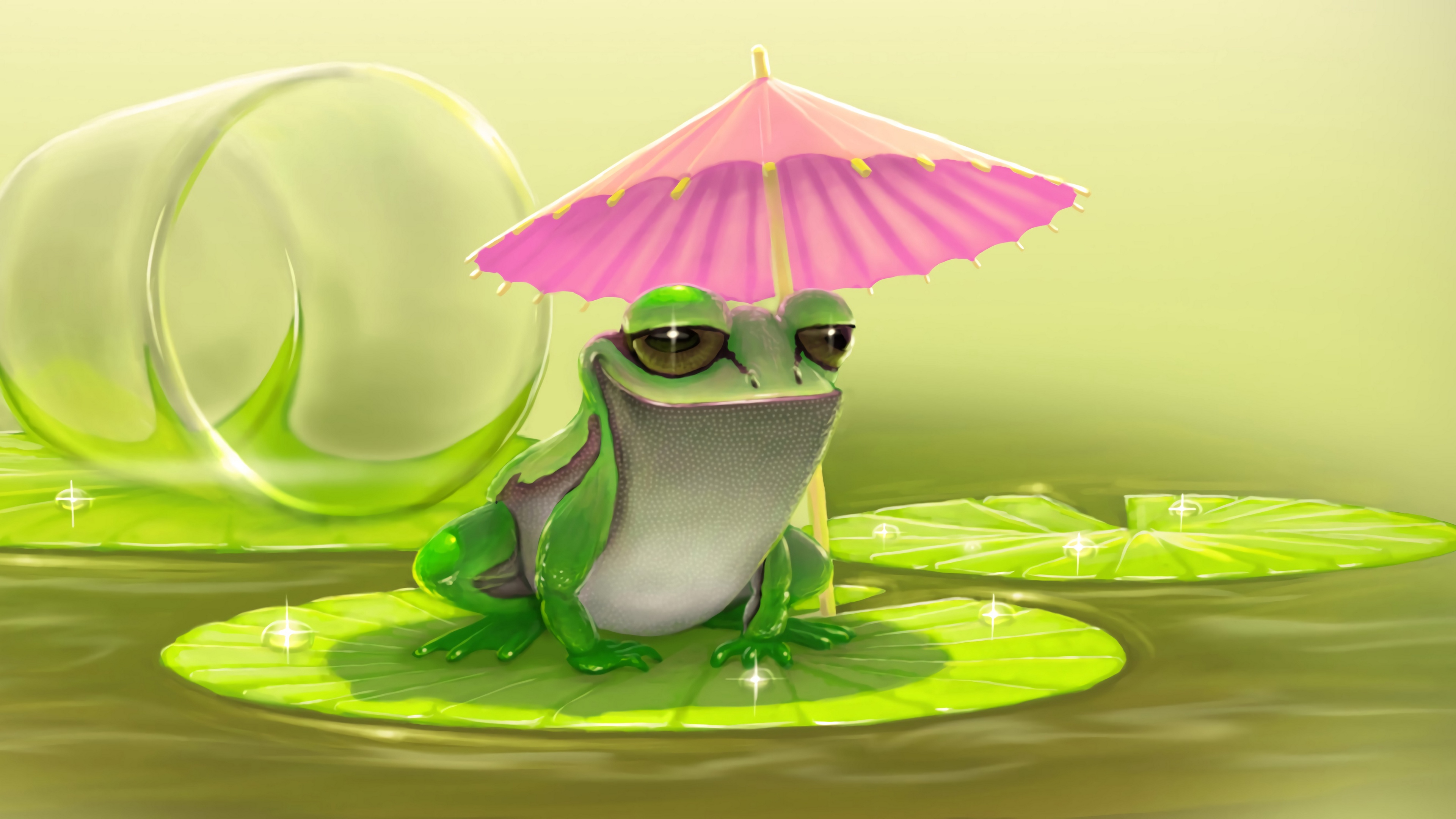 Description: A frog with a pink umbrella sitting on a lily pad in a pond of water with lily pads around it.