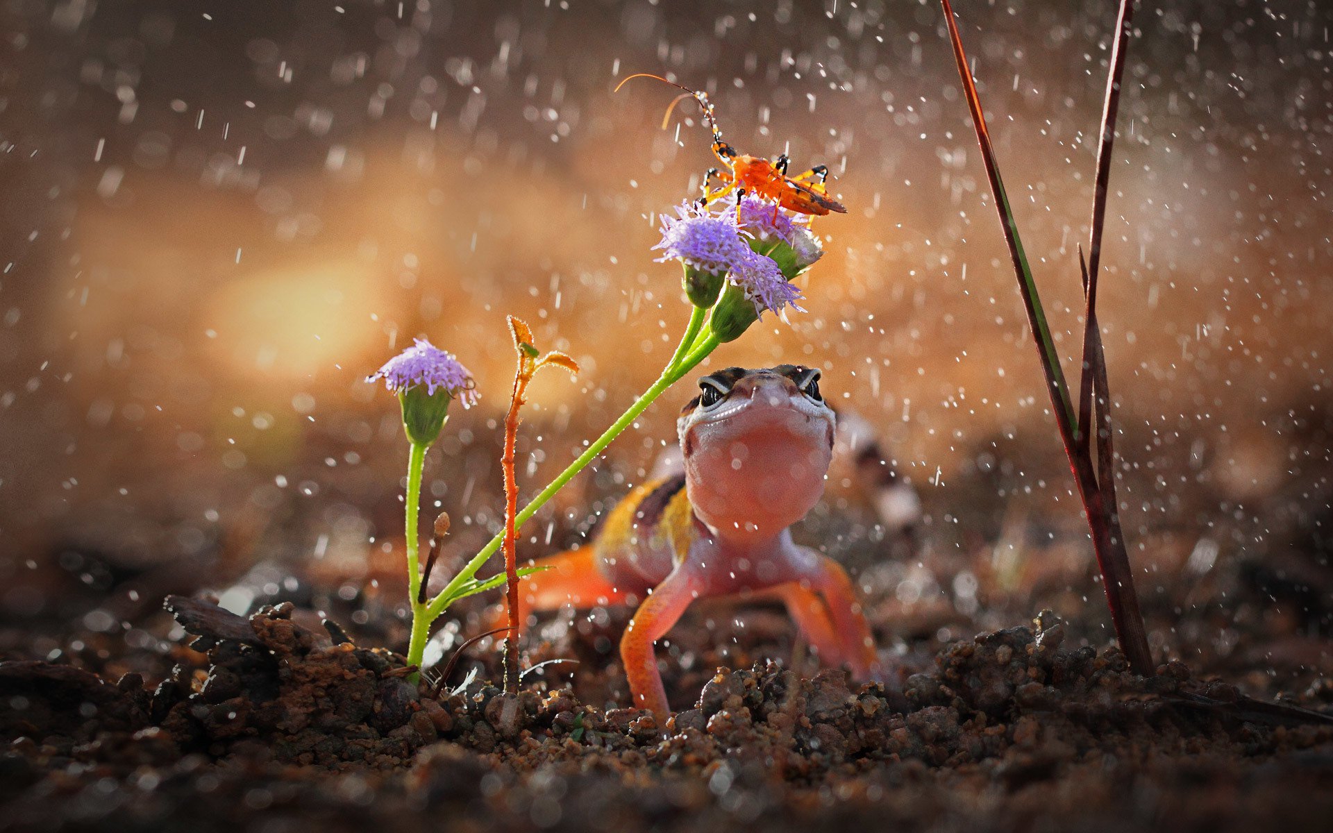 Description: A frog is standing in the rain with a flower in its mouth and a bug on its back.