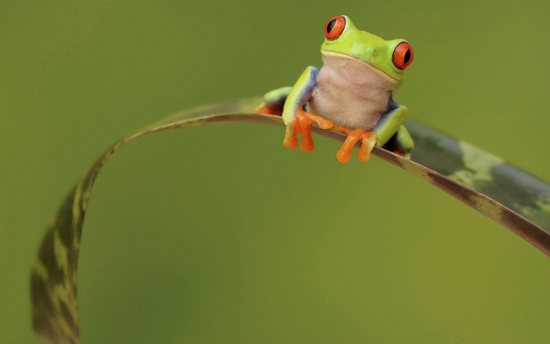 Description: A frog with red eyes sitting on a plant stem with a long stem in the foreground and a green background.