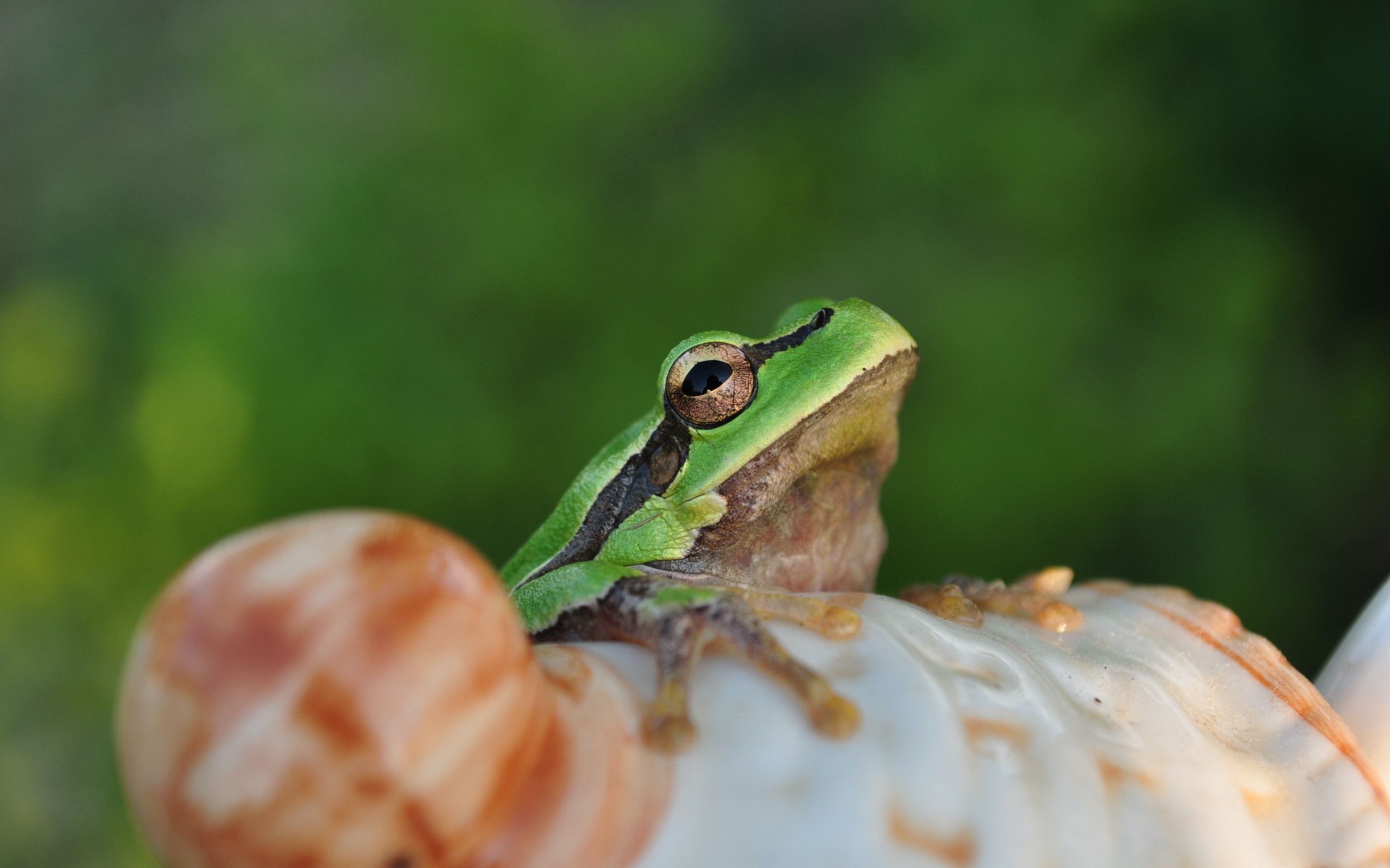 Description: A frog sitting on top of a shell next to a snail on a table top with a green background.