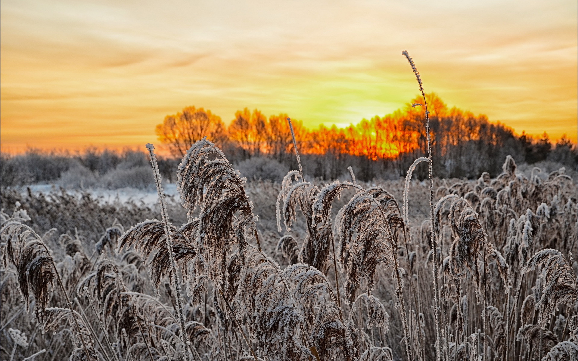 Description: A field with tall grass covered in frost at sunset with a sky background and trees in the distance with a yellow and orange sky.