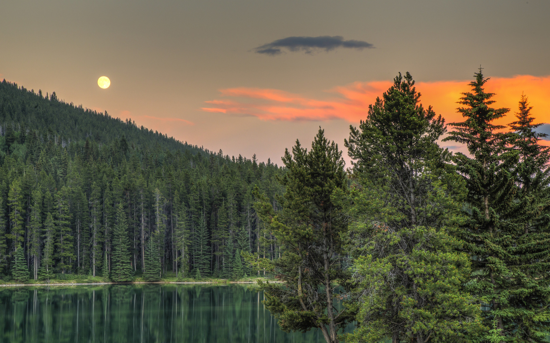 Description: A full moon is seen over a lake surrounded by trees and mountains in the distance.