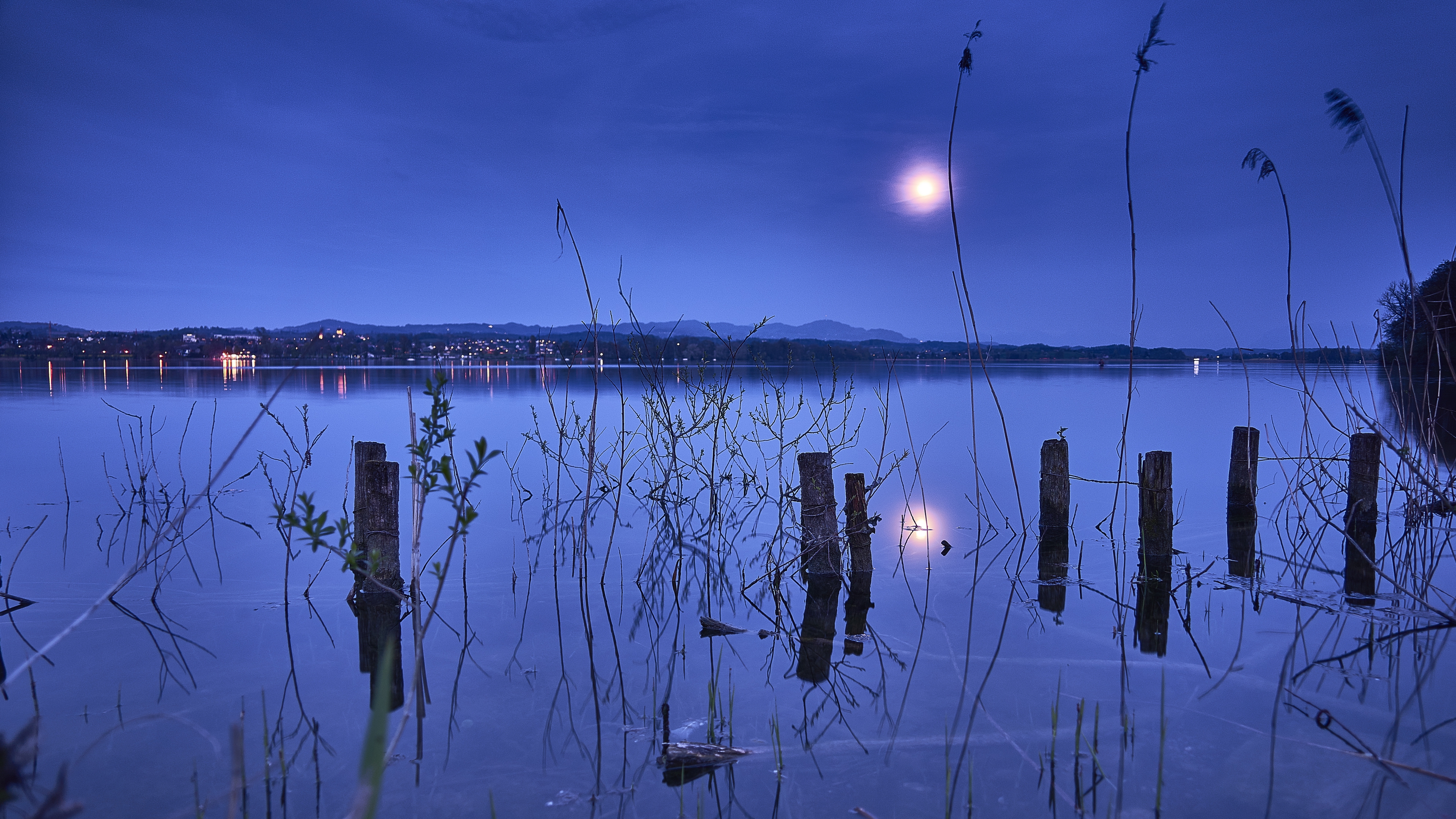 Description: A full moon is seen over a lake at night with reeds in the foreground and a dock in the foreground.