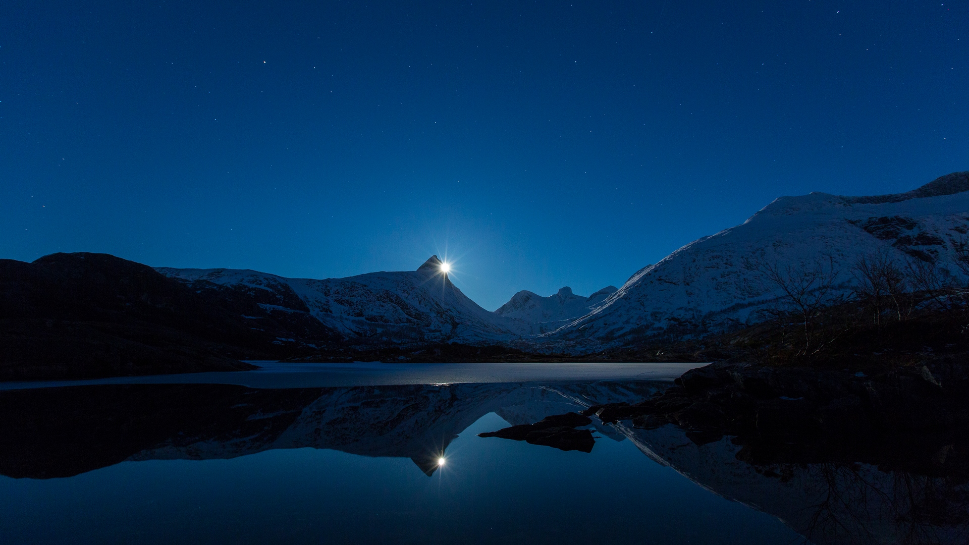 Description: A full moon is seen over a mountain range at night with a lake in the foreground and a mountain range in the background.