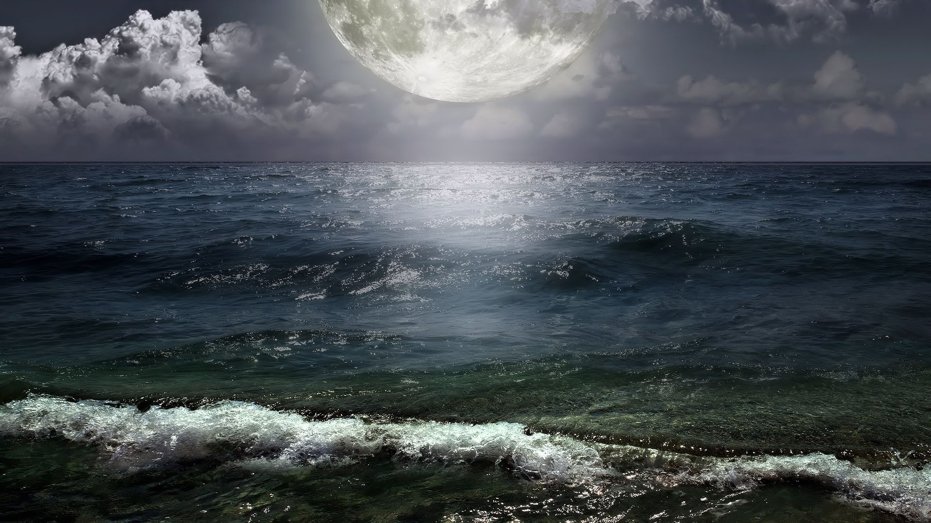 Description: A full moon over the ocean with waves in the foreground and clouds in the background.