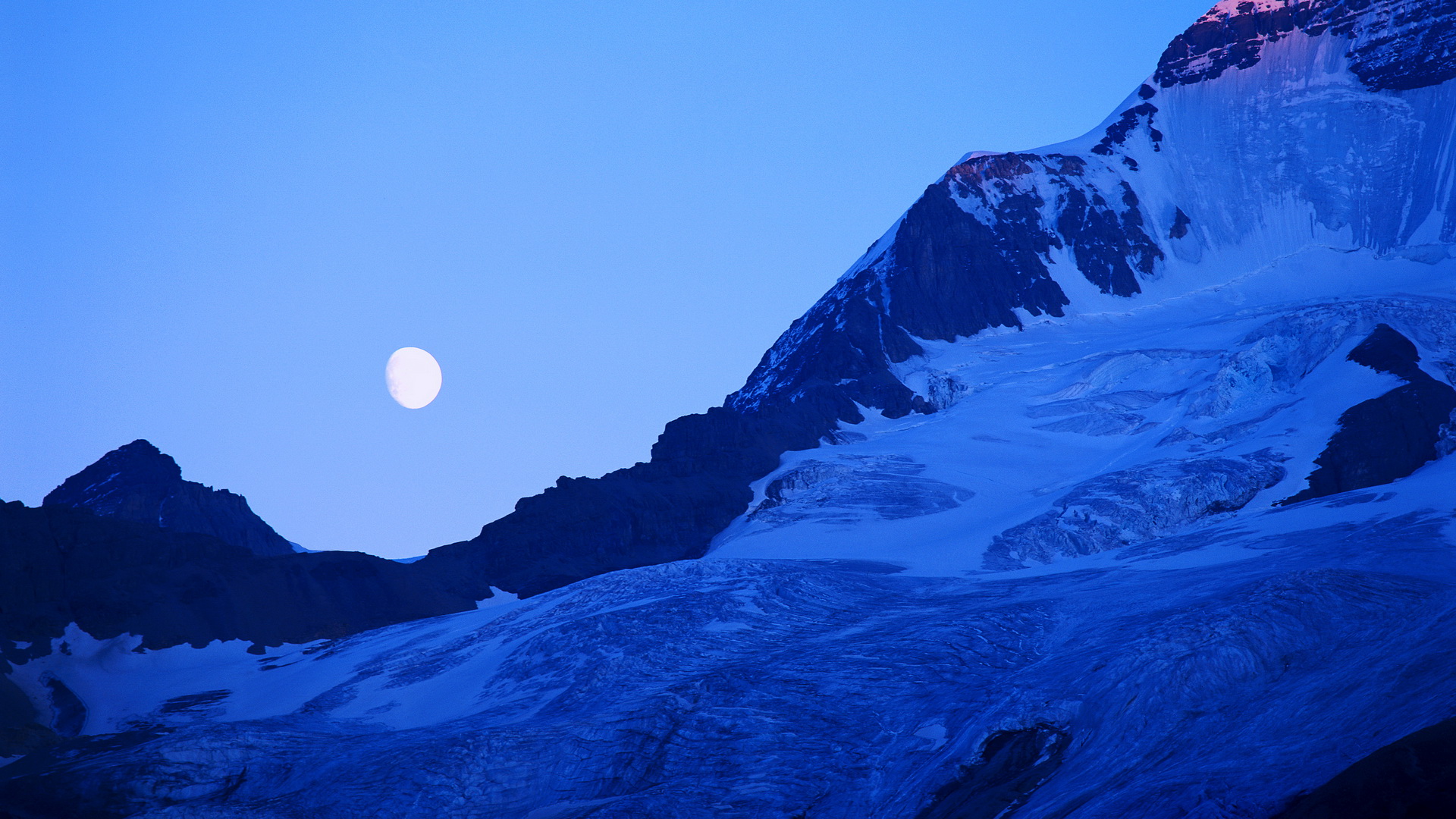 Description: A full moon is seen above a snowy mountain range at dusk.