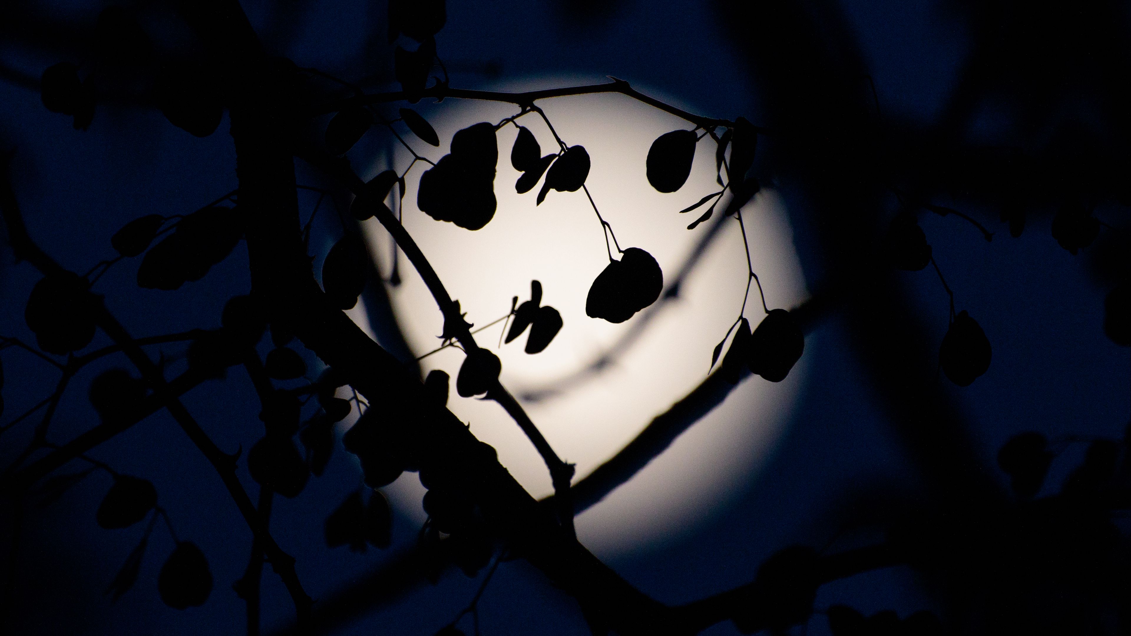 Description: A full moon is seen through the branches of a tree in the dark night sky with leaves on it.