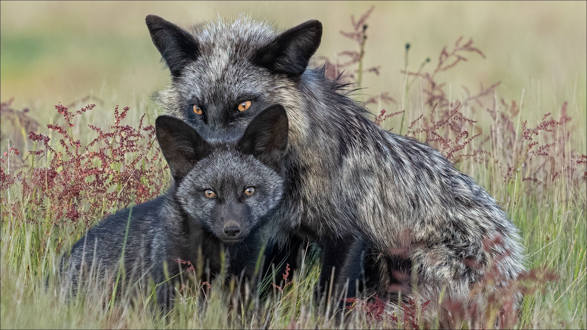 Description: A couple of animals that are in the grass together in the grass and flowers in the background.