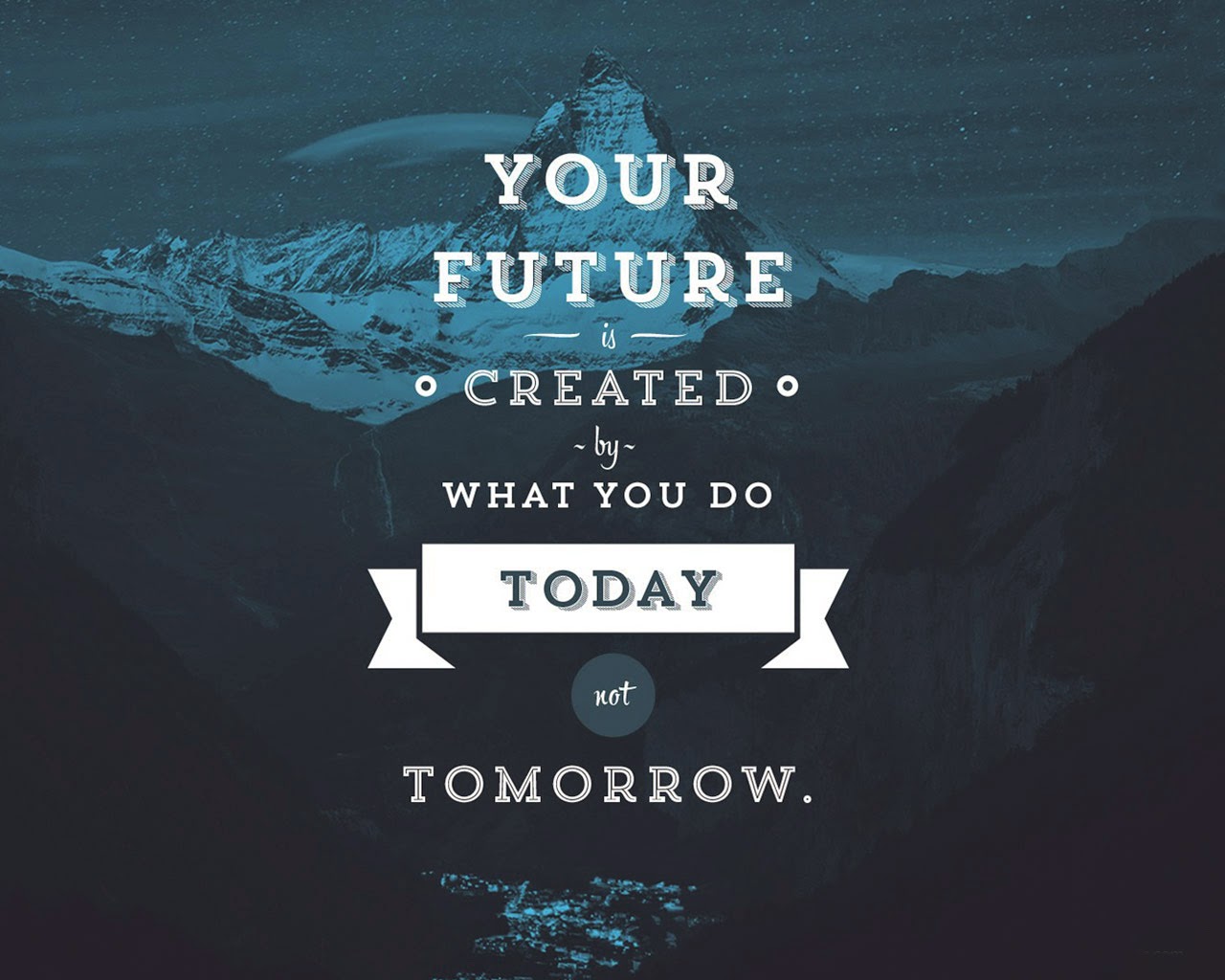 Description: A quote that reads your future created by what you do today and tomorrow tomorrow on a mountain range with a blue sky.