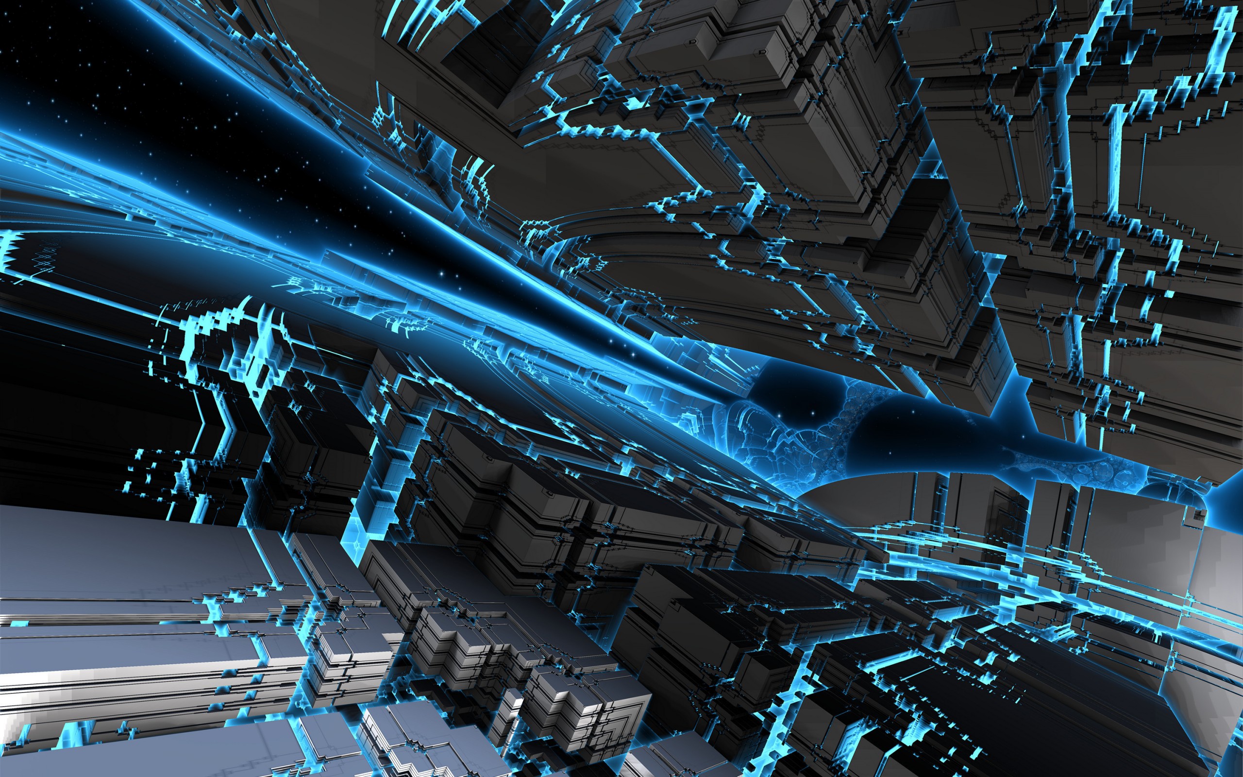 Description: A futuristic abstract background with blue lines and shapes in the center of the image and a black background with white lines.