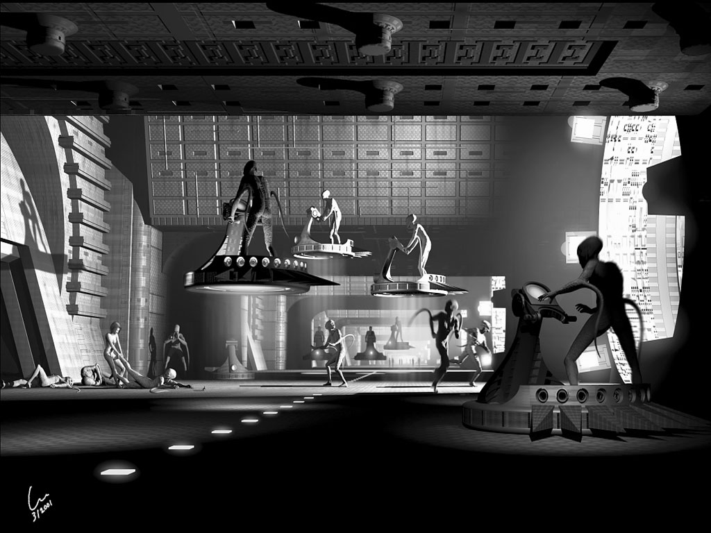 Description: A black and white photo of a futuristic building with people in it and a man in a suit and tie.