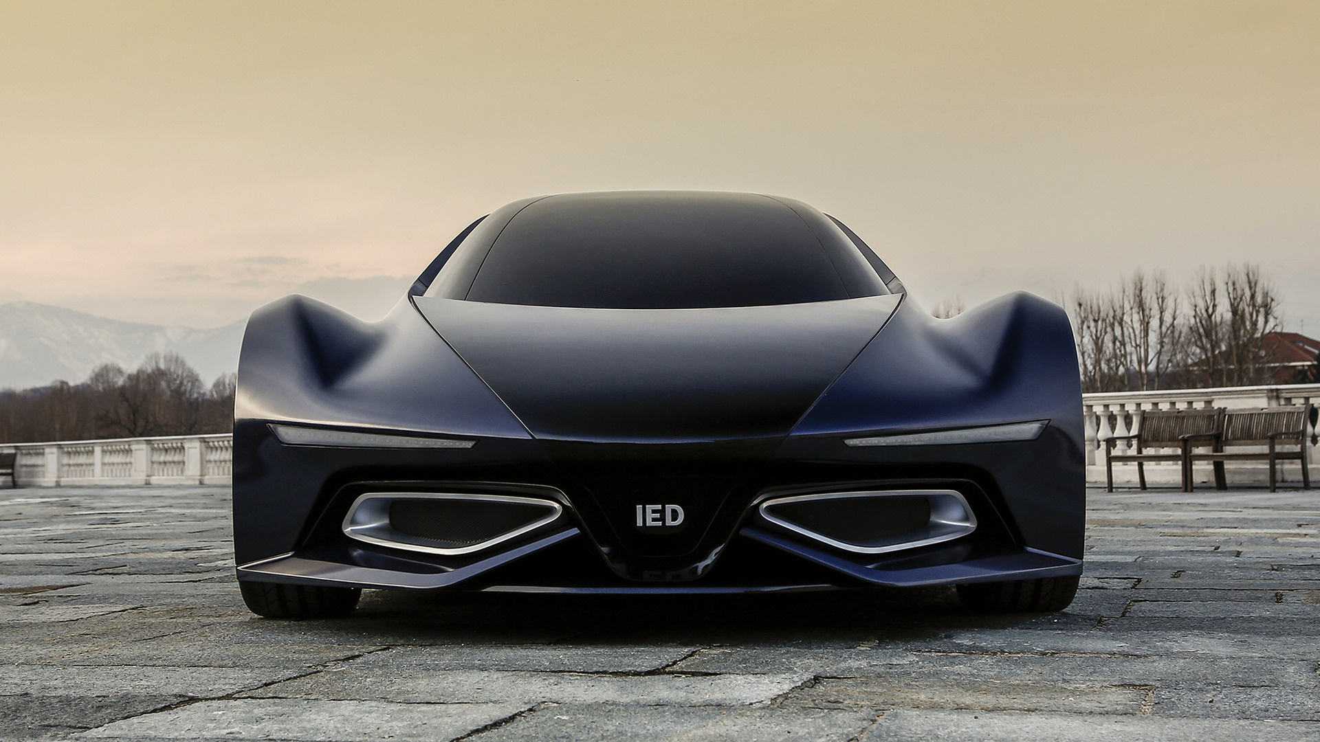 Description: A futuristic car is parked on a brick surface in front of a building with a mountain in the background.