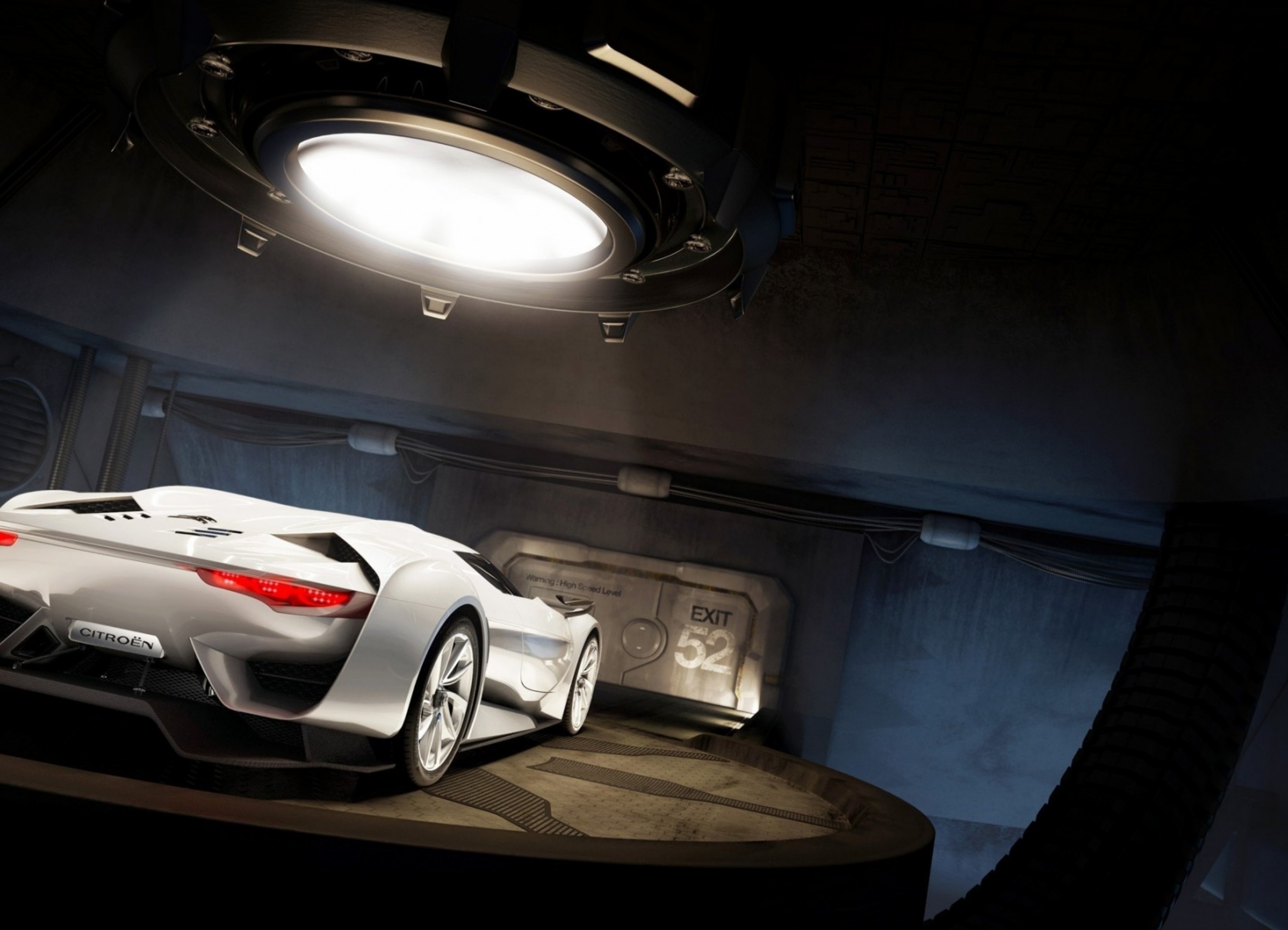 Description: A futuristic car is shown in a dimly lit room with a round light above it and a round light above it.