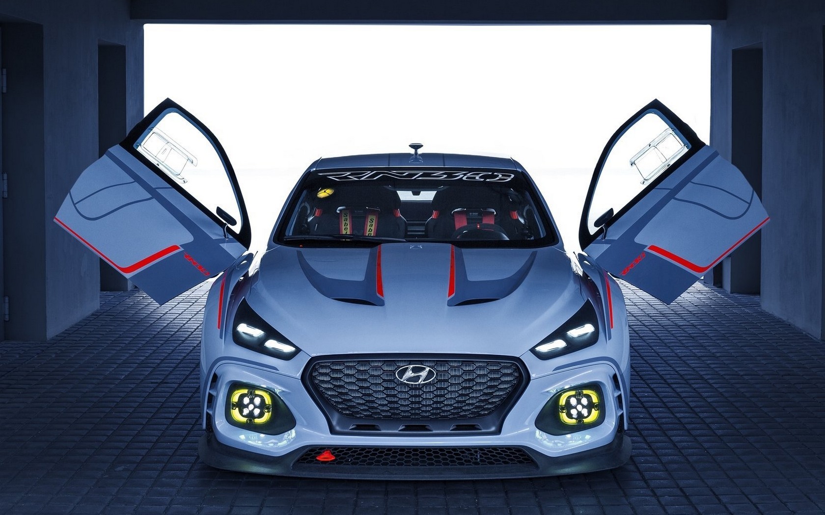 Description: A car with its doors open in a garage with a white background and a black floor with a red stripe.