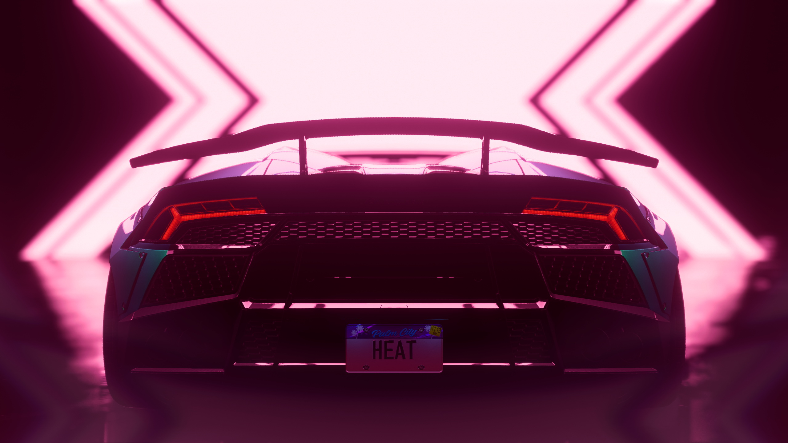 Description: A car is shown in a futuristic setting with a neon light behind it and a license plate on the front.