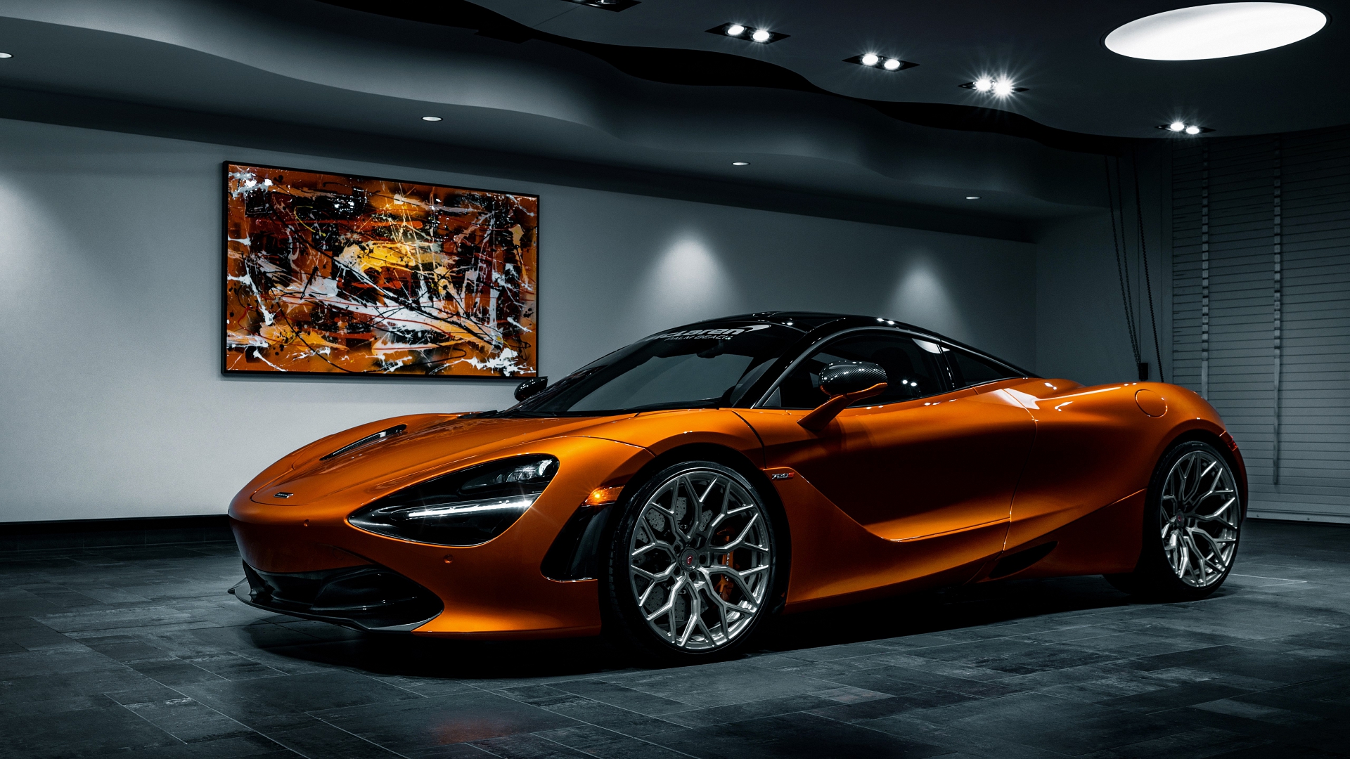 Description: A car is parked in a room with a painting on the wall behind it and a painting on the wall behind it.