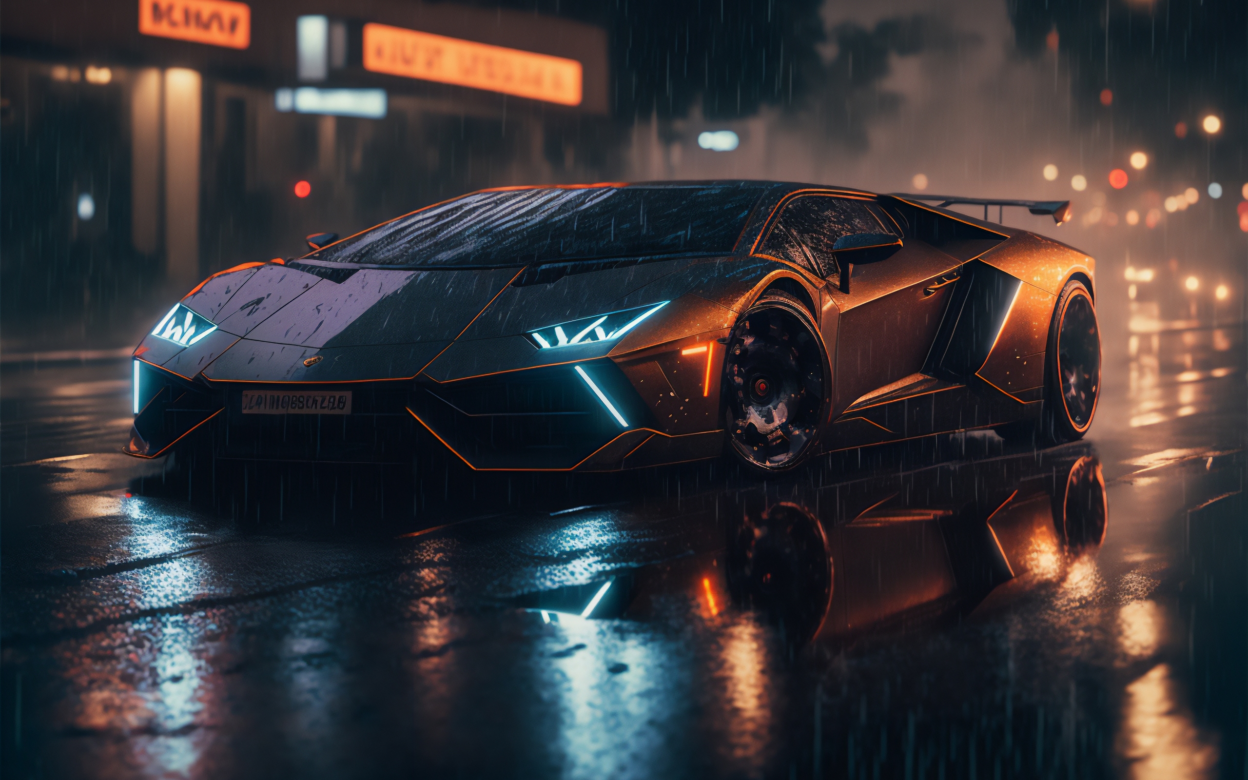 Description: A futuristic car is parked on a rainy street at night in the rain.