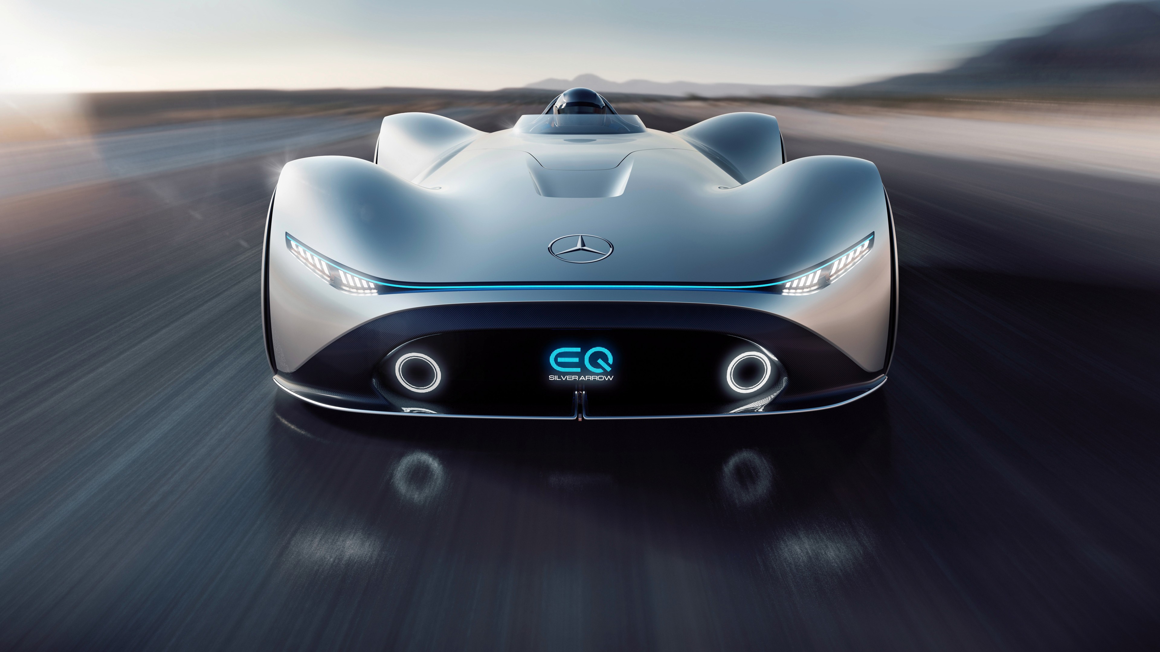 Description: A futuristic car driving down a road with a sky background and a blurry image of the front of the car.
