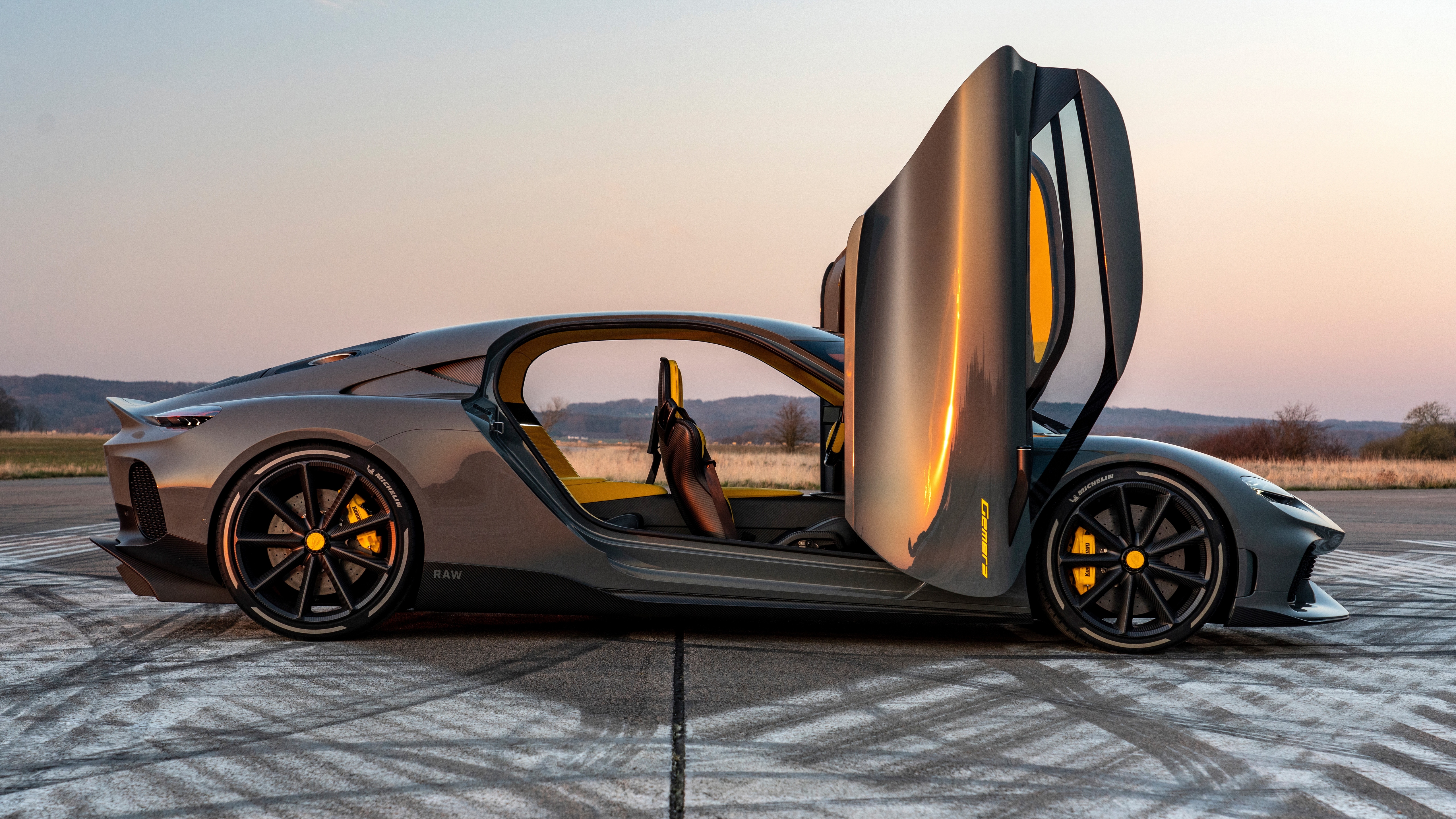 Description: A futuristic car with its doors open on a runway at sunset or dawn with a person in the doorway.