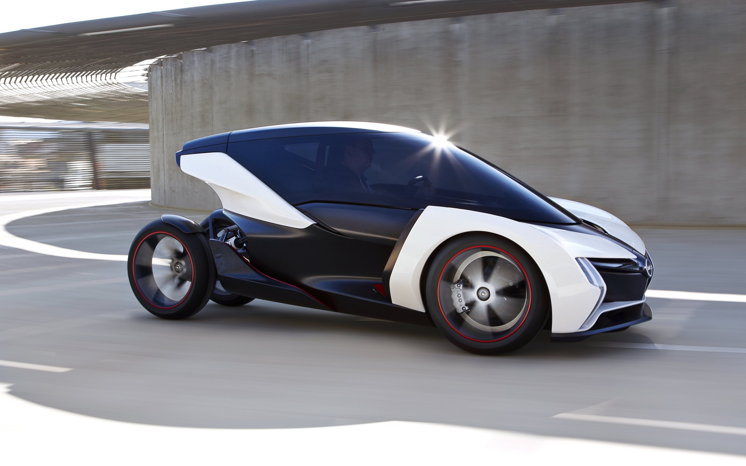 Description: A futuristic car driving down a street next to a building and a bridge in the background with a light shining on the car.