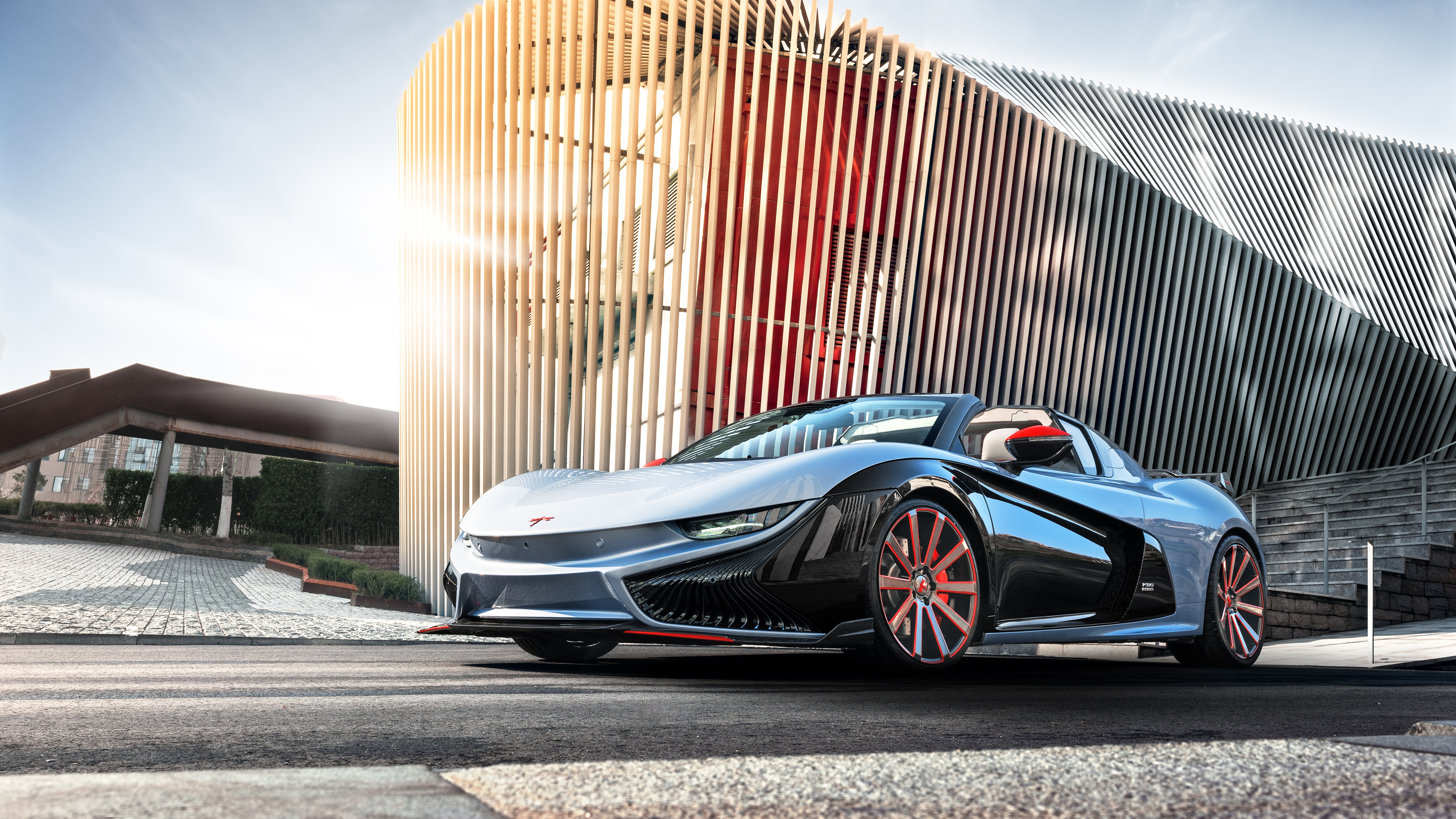 Description: A futuristic car parked in front of a building with a red stripe on the side of it's door.