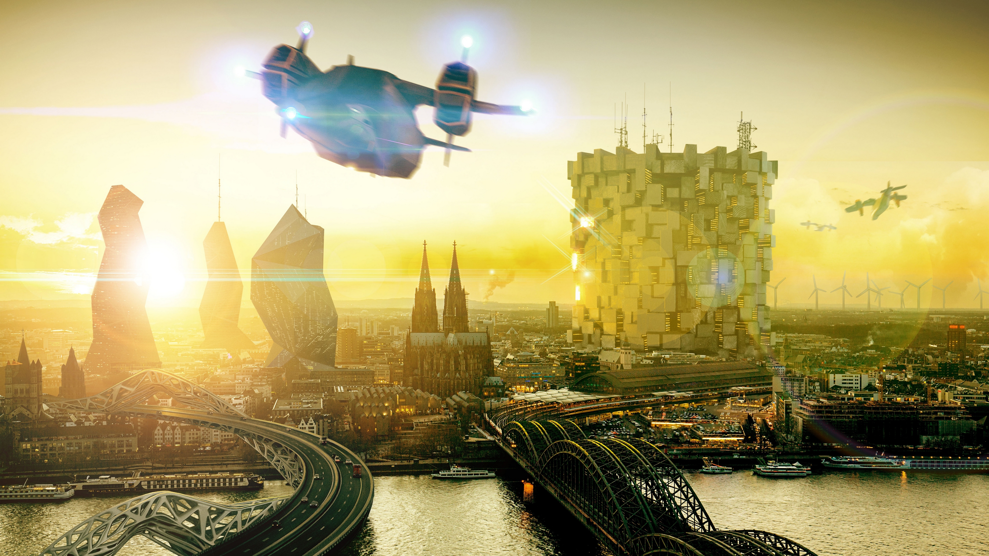 Description: A futuristic city with a futuristic airplane flying over it at sunset or dawn with a futuristic bridge and a futuristic city in the background.
