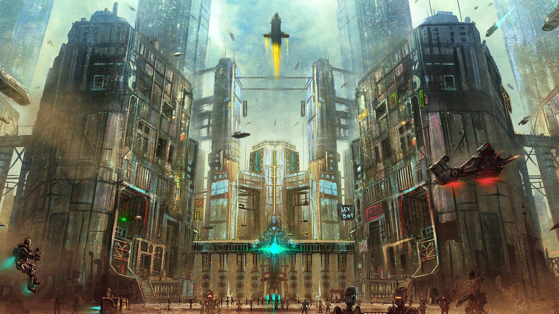 Description: A futuristic city with a green light in the middle of it and a cross on the top of the building.