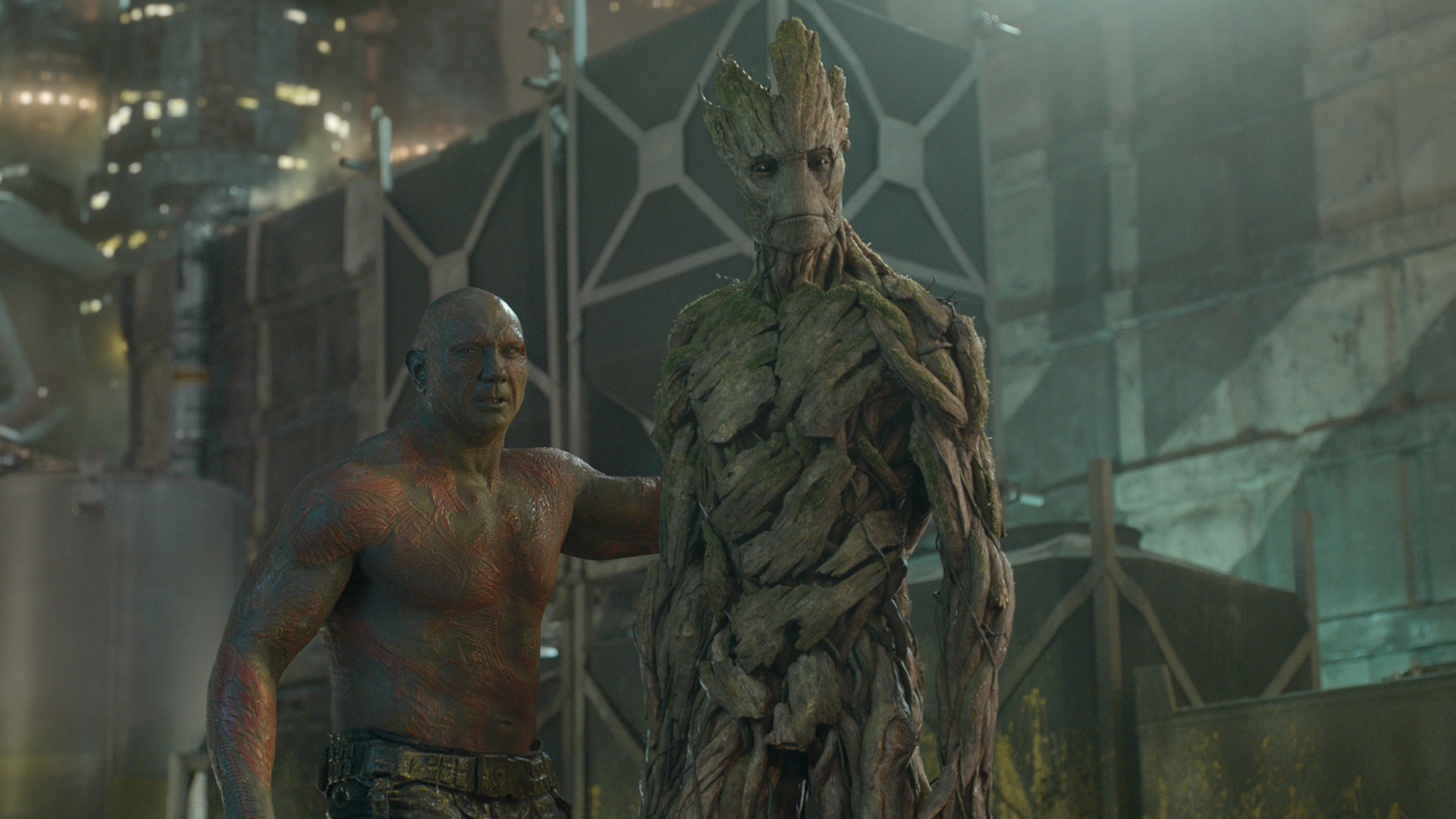 Description: A man standing next to a groote in a futuristic city at night with a giant object in the background.