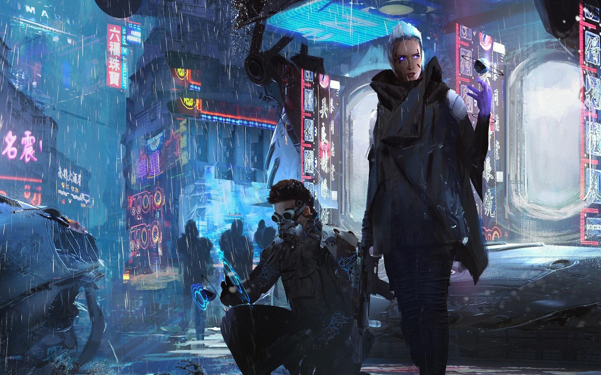 Description: A man and a woman standing in a futuristic city with neon lights and neon signs on the buildings and neon signs.