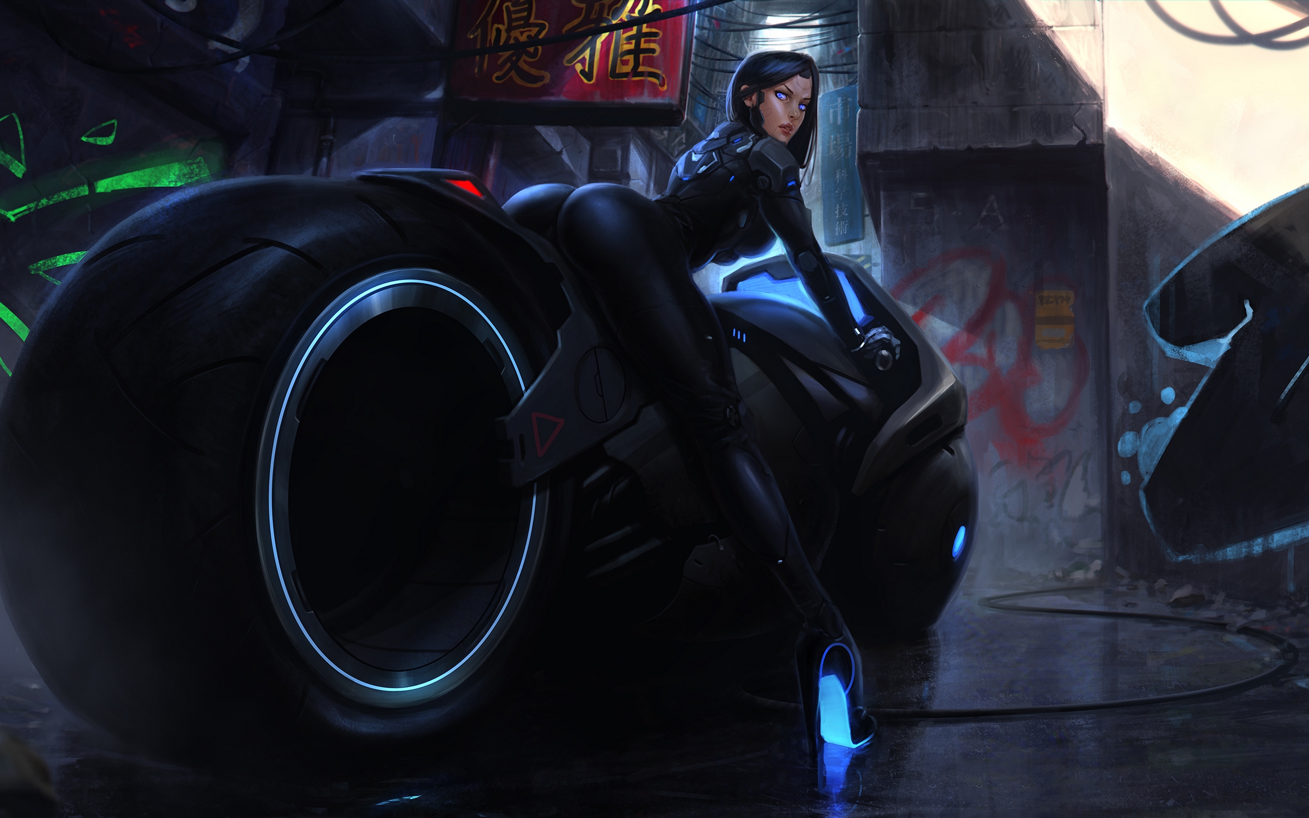 Description: A woman riding a motorcycle in a futuristic city with neon lights on the tires and a neon light on the tire.