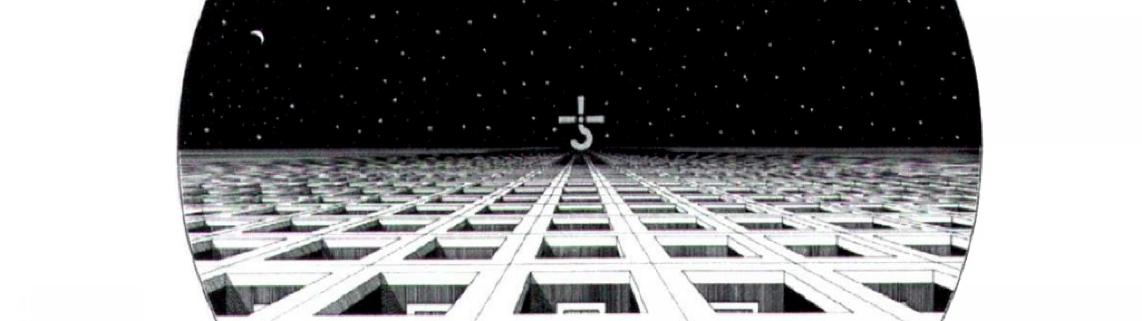 Description: A computer generated image of a futuristic city at night with stars in the sky and a cross on the top of the structure.