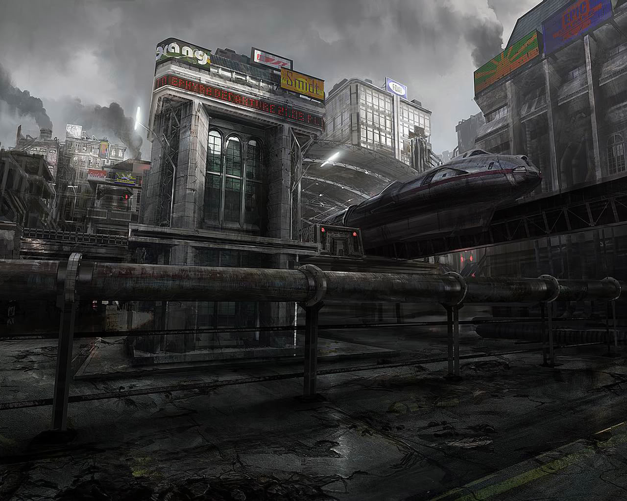 Description: A futuristic city with a train on the tracks and a train station in the foreground.