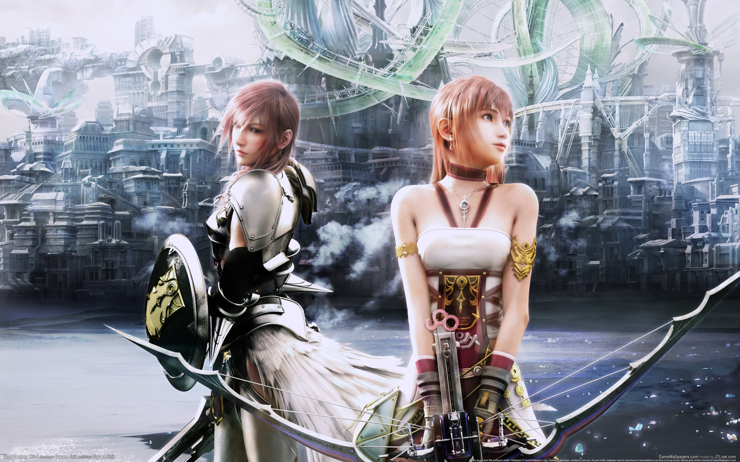 Description: Two anime characters are standing in front of a cityscape with a futuristic city in the background and a futuristic city in the foreground.