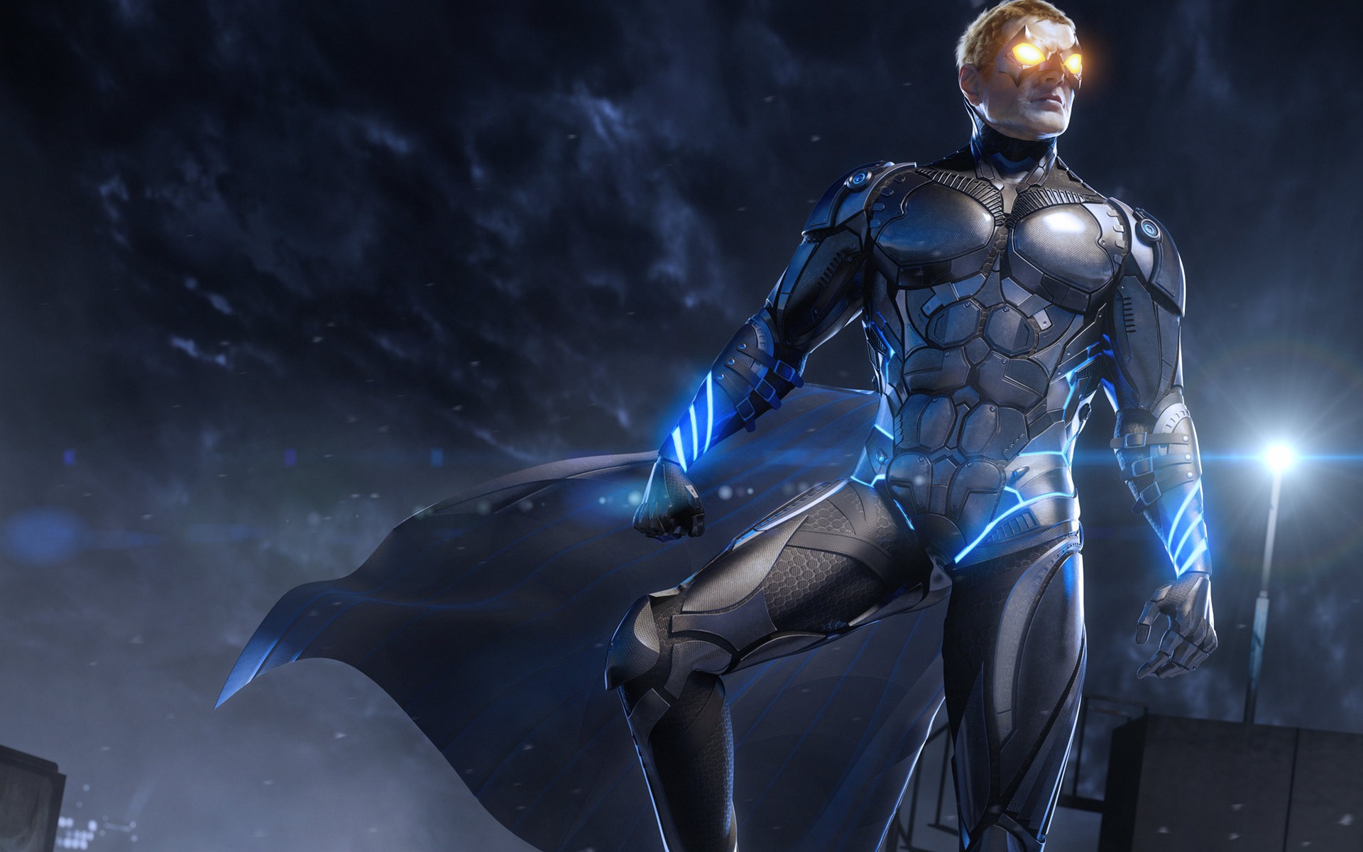 Description: A man in a futuristic suit standing in the dark with a glowing light on his face and a cape on his shoulders.
