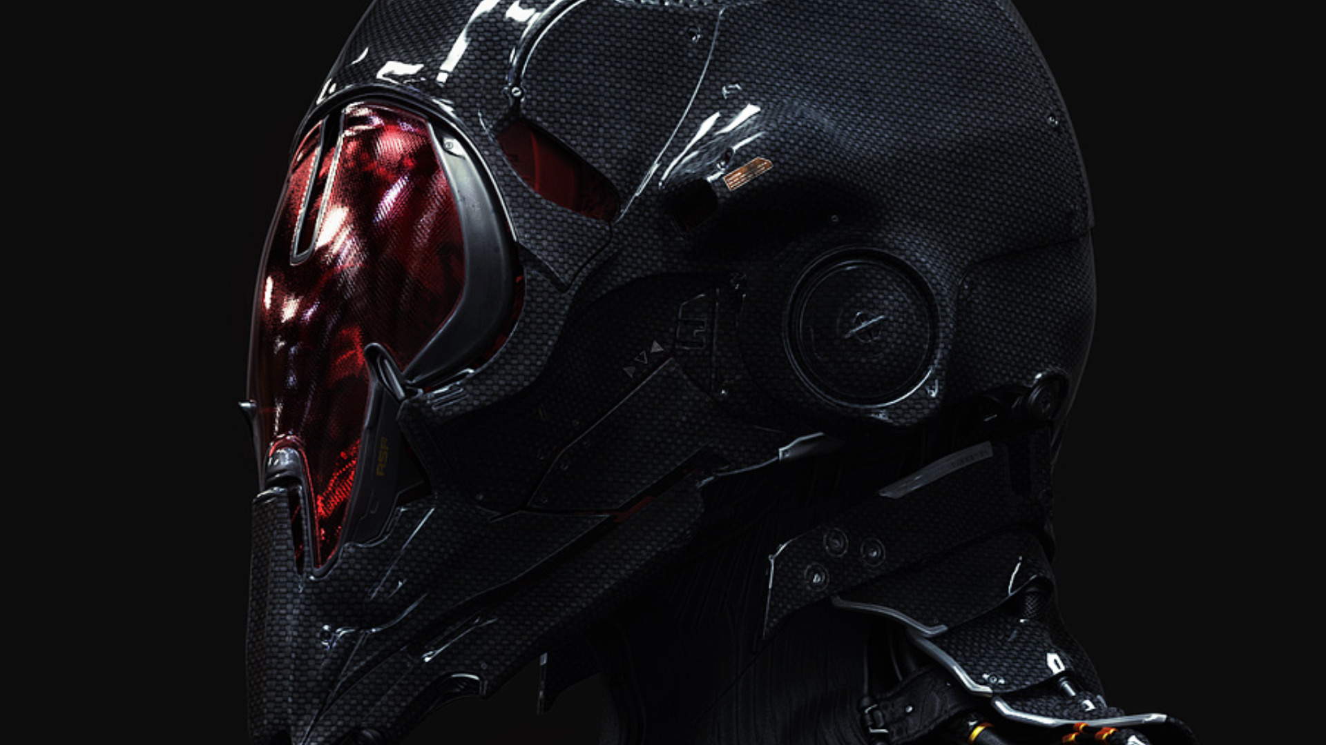 Description: A futuristic helmet with a red light on it's face and a black background with a black background.