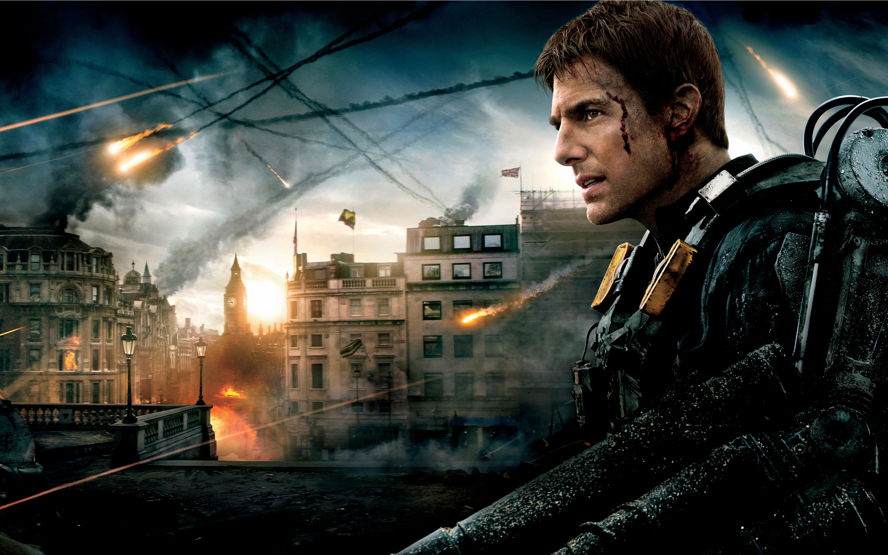 Description: A man in a futuristic suit standing in front of a city skyline with a lot of smoke and flames.