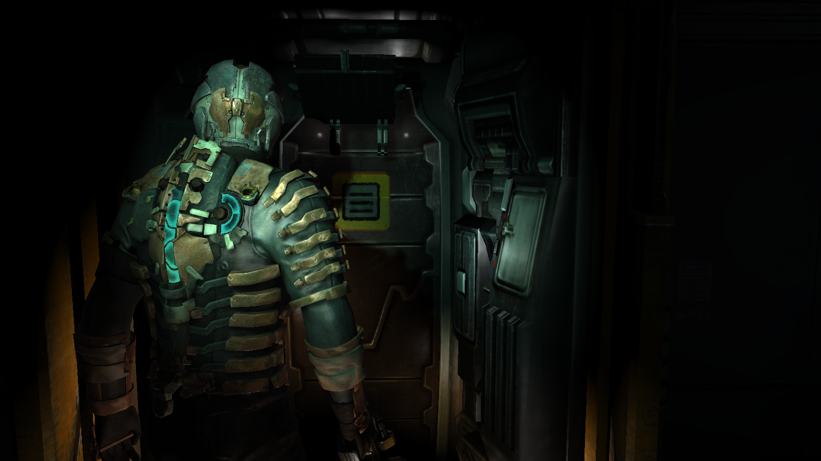 Description: A man in a futuristic suit walking into a dark room with a neon light on his chest and arm.