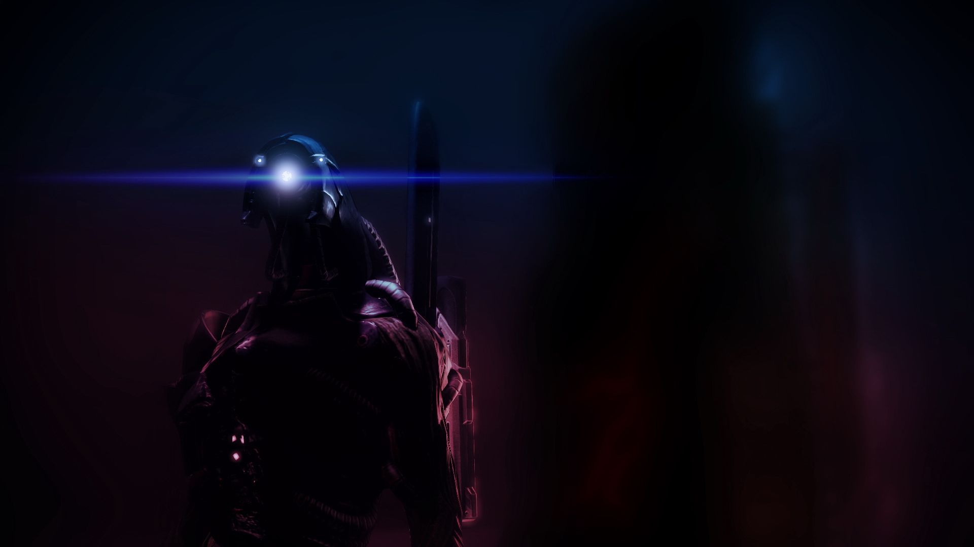 Description: A man in a futuristic suit with a gun in his hand and a glowing light on his head.