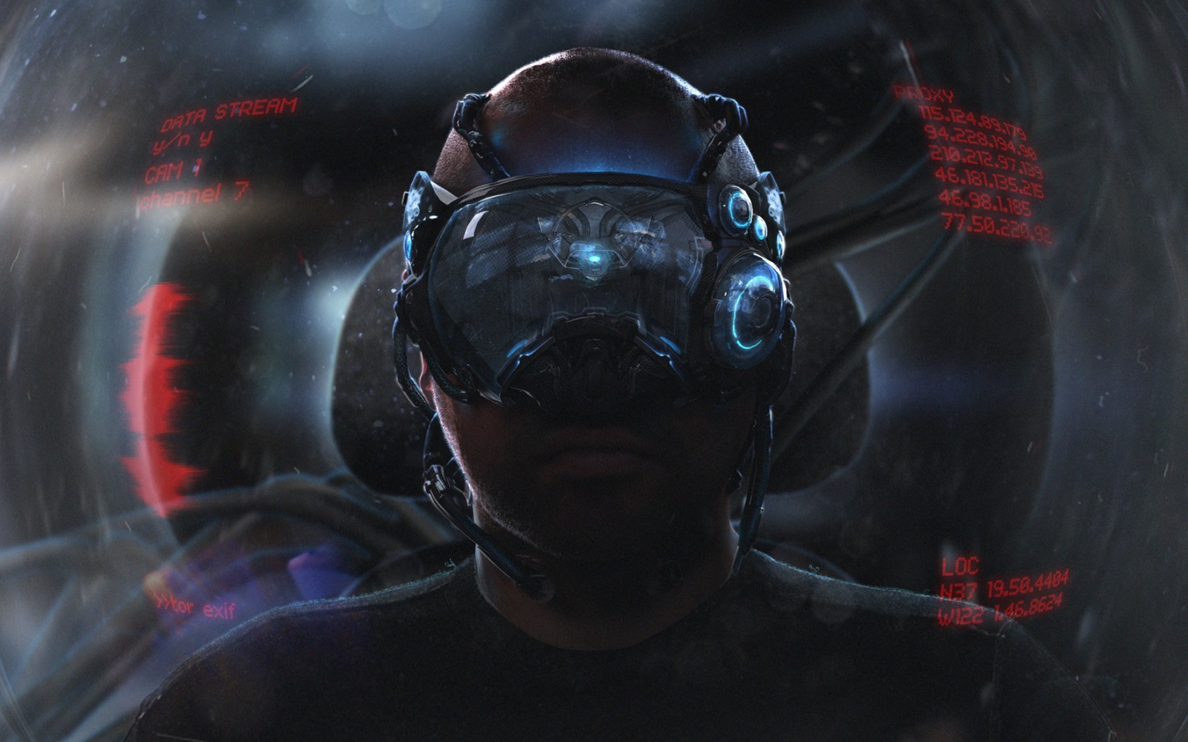 Description: A man wearing a futuristic helmet and goggles in a futuristic setting with a red light coming from the center of the image.