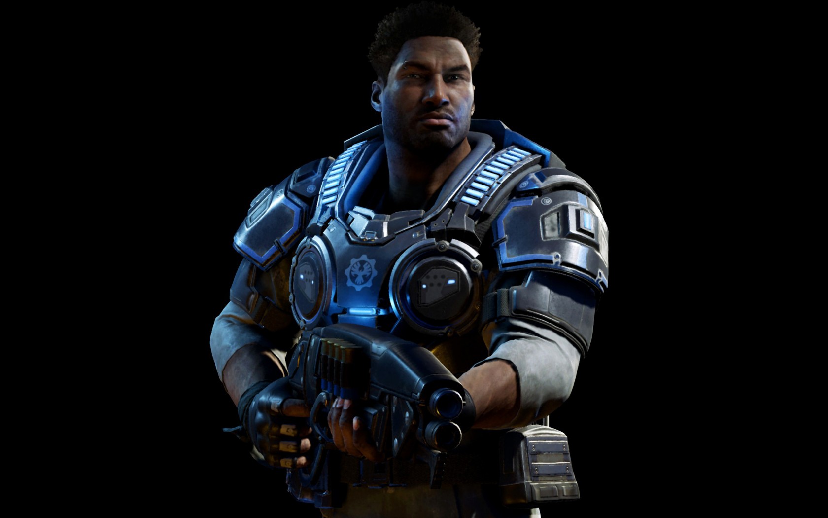 Description: A man in a futuristic suit holding a gun and a glove in his hand.
