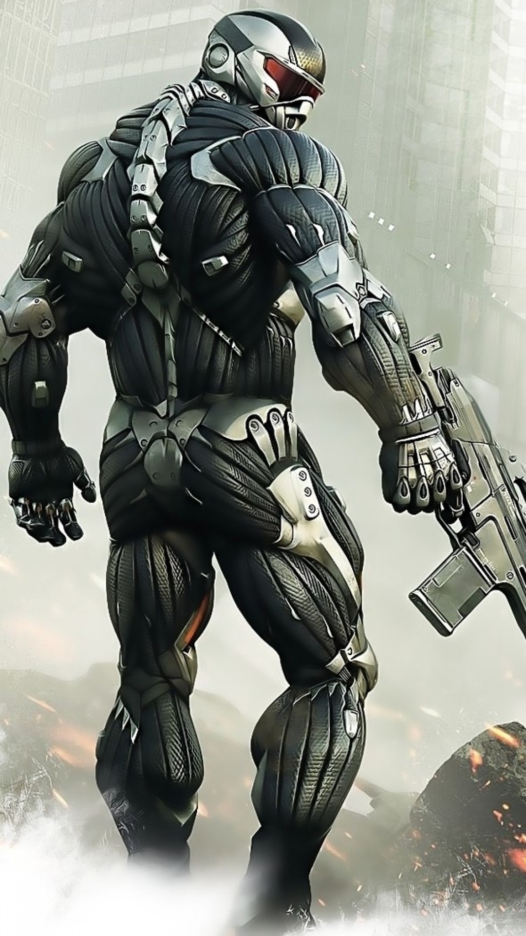 Description: A man in a futuristic suit holding a gun and a gun in his hand.