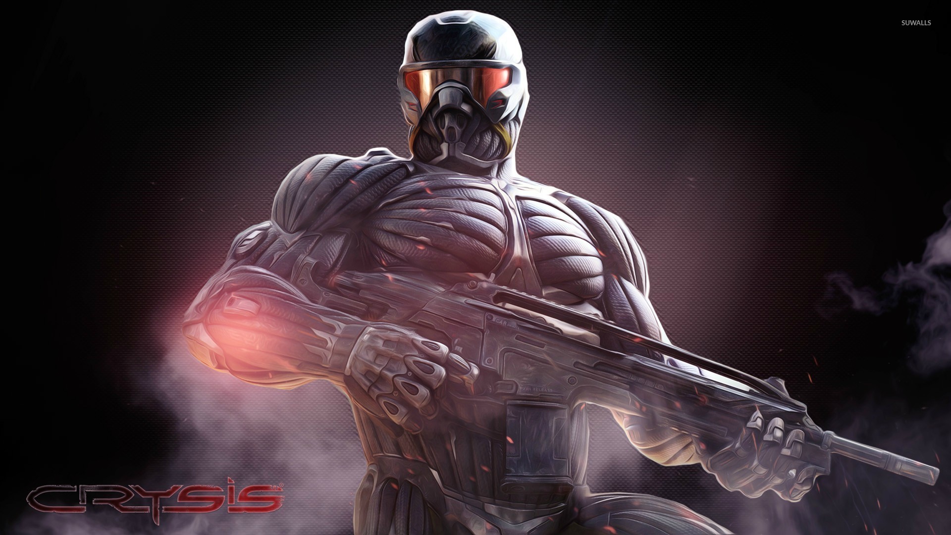 Description: A man in a futuristic suit holding a gun in his hand and smoke behind him.