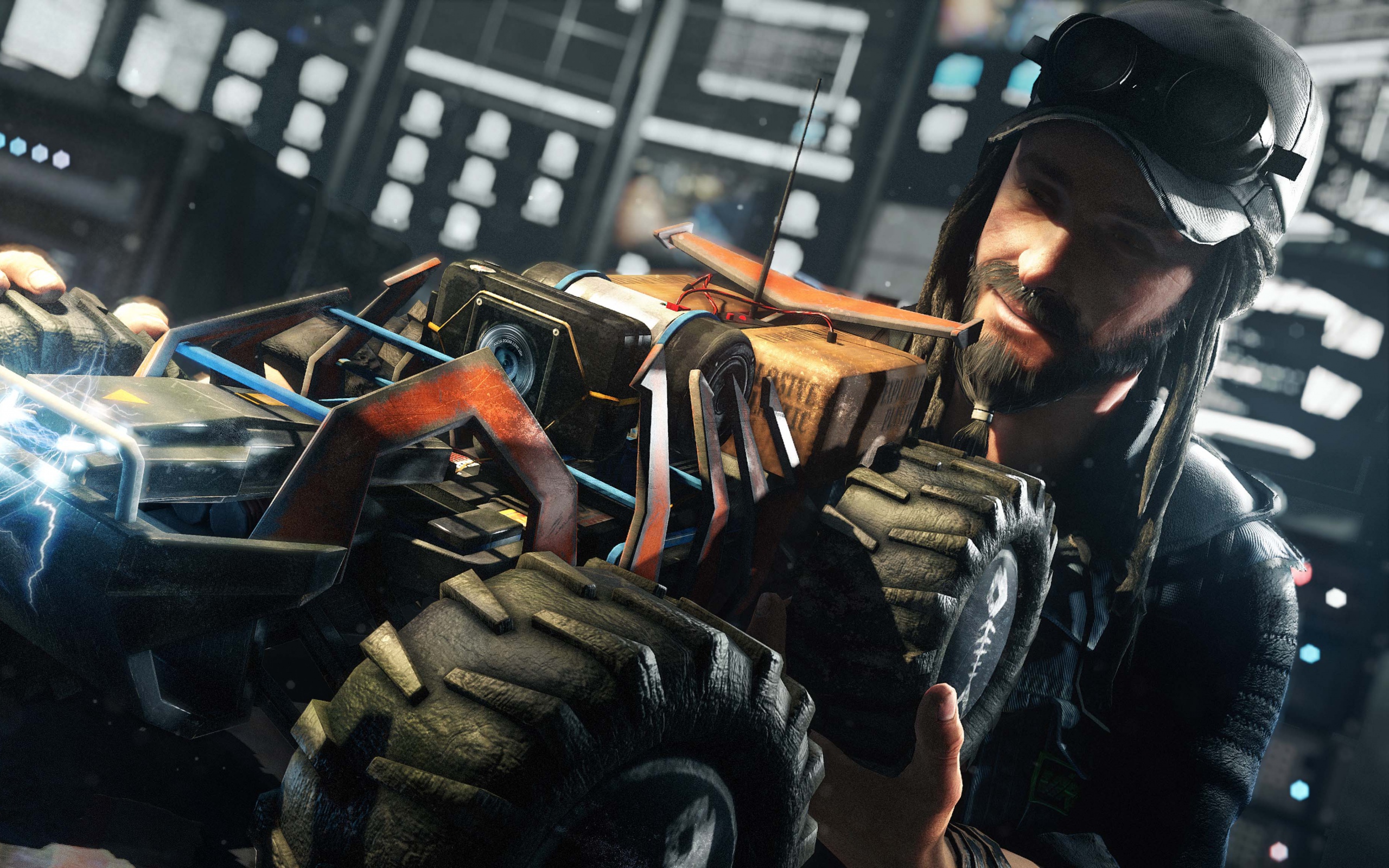 Description: A man holding a large truck in a futuristic setting with other vehicles in the background and a large building in the background.