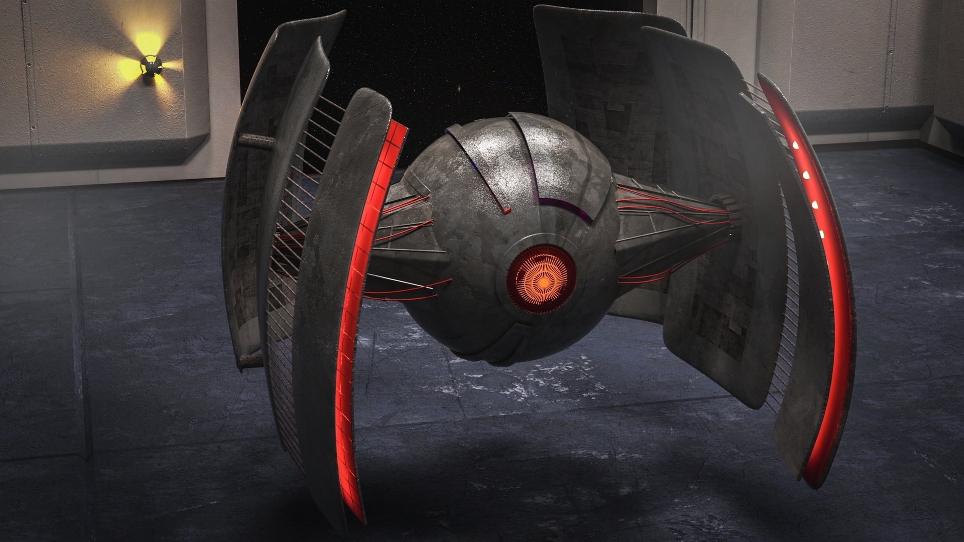 Description: A futuristic looking object with a red light on it's side and a black background with a yellow light.