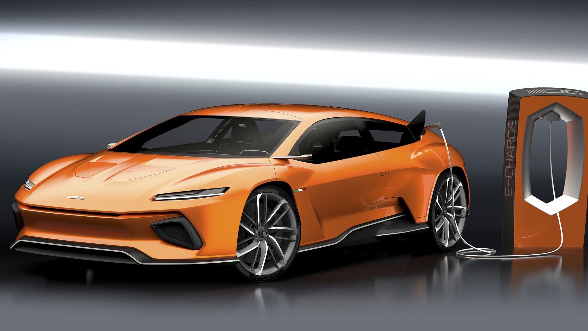 Description: A futuristic orange car is charging in a dark room with a light beam behind it and a white light behind it.