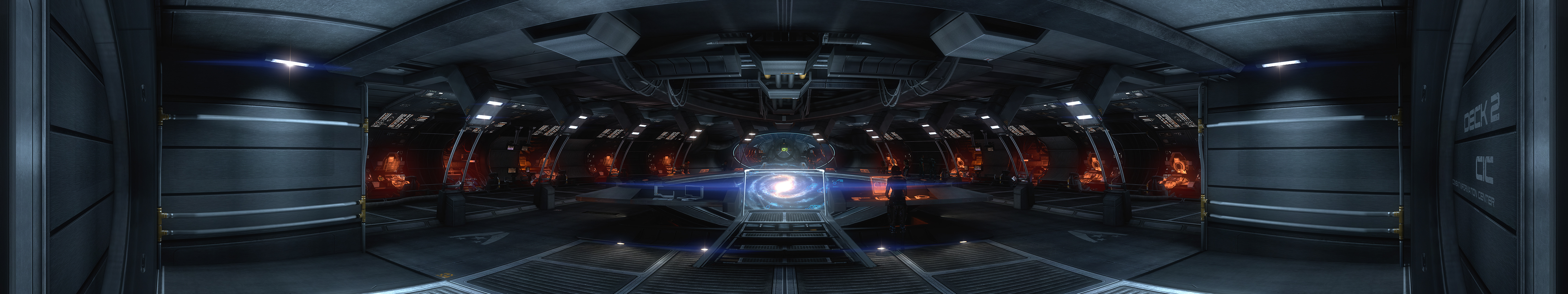 Description: A futuristic looking room with a large mirror in the center of it and a blue light at the end.