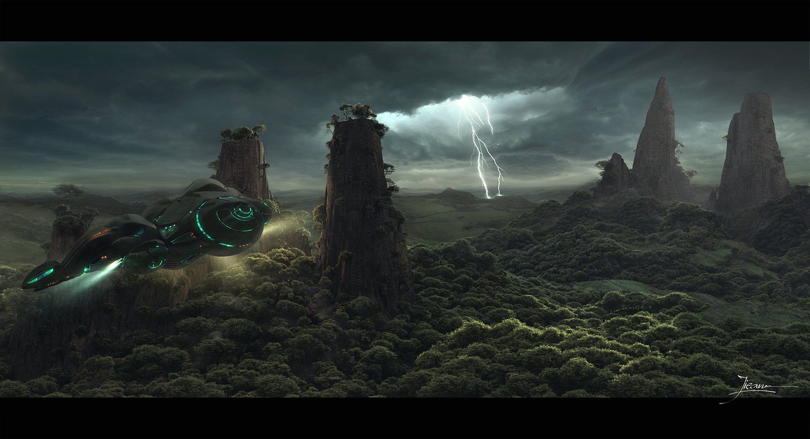 Description: A futuristic sci - fi filther flying over a green mountain range with lightning in the sky above.