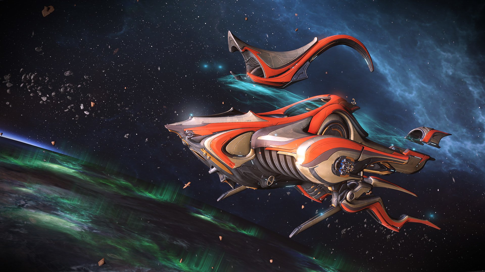 Description: A futuristic space ship flying through the air over a planet with stars and a moon in the background.